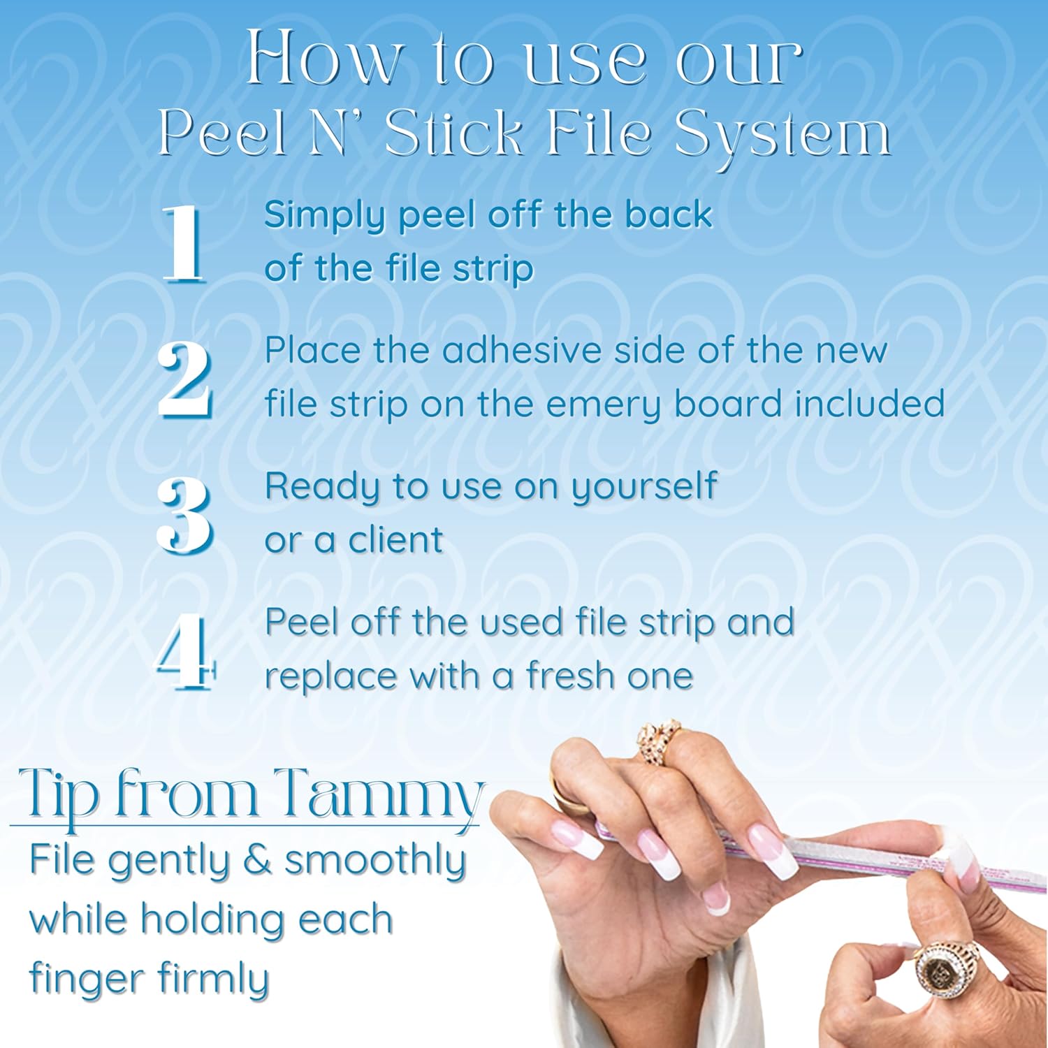 - Nail Tech Must Haves – Peel N Stick Nail files are essential nail design tools for manicures. Our 180 Grit Nail Files shape natural finger nails + toe nails fast with peelable, refill abrasive strips.
