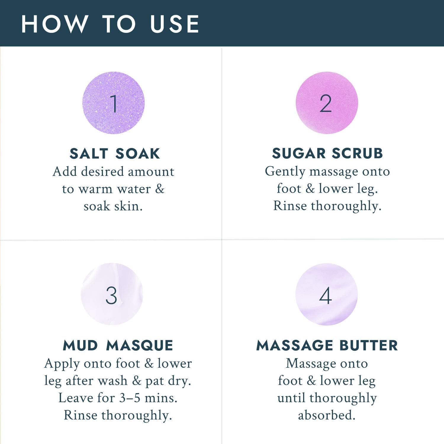 - 4 Easy Steps to Perfect Pedicures. This pedicure kit contains a salt soak to detoxify and deodorize the feet, a sugar scrub to exfoliate skin, a mud masque to cleanse pores and smooth skin, and a massage butter to hydrate and soothe skin.