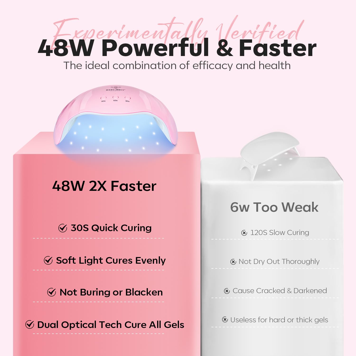 - EFFICIENT NAIL LAMP: Modelones 48W nail lamp features 3 timer settings (30s, 60s, 90s) and an automatic sensor that turns the light on when you insert your hand and off when you remove it. We recommend using the 30-60s settings for thinner layers of poly gel and for thicker layers, 60-90s or more to ensure thorough curing. Enjoy a faster and more convenient nail experience with our 48W nail lamp!
