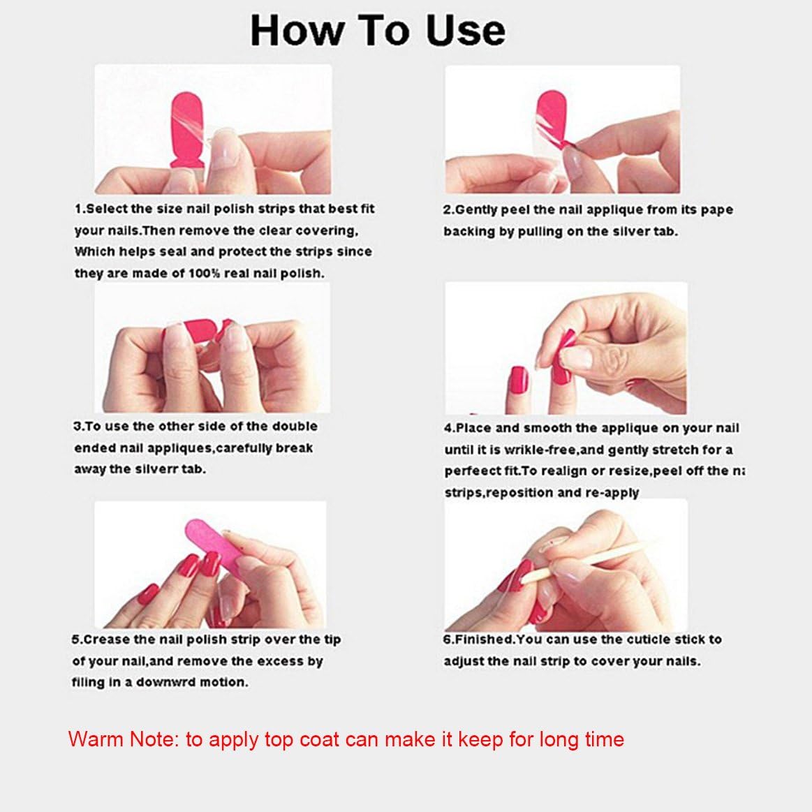 - Safe Material With Eco Friendly Technique: Easy to apply onto your nails with our instructions, none of Nail polish/Glue/Nail polish remover are need, that would not hurt nails.