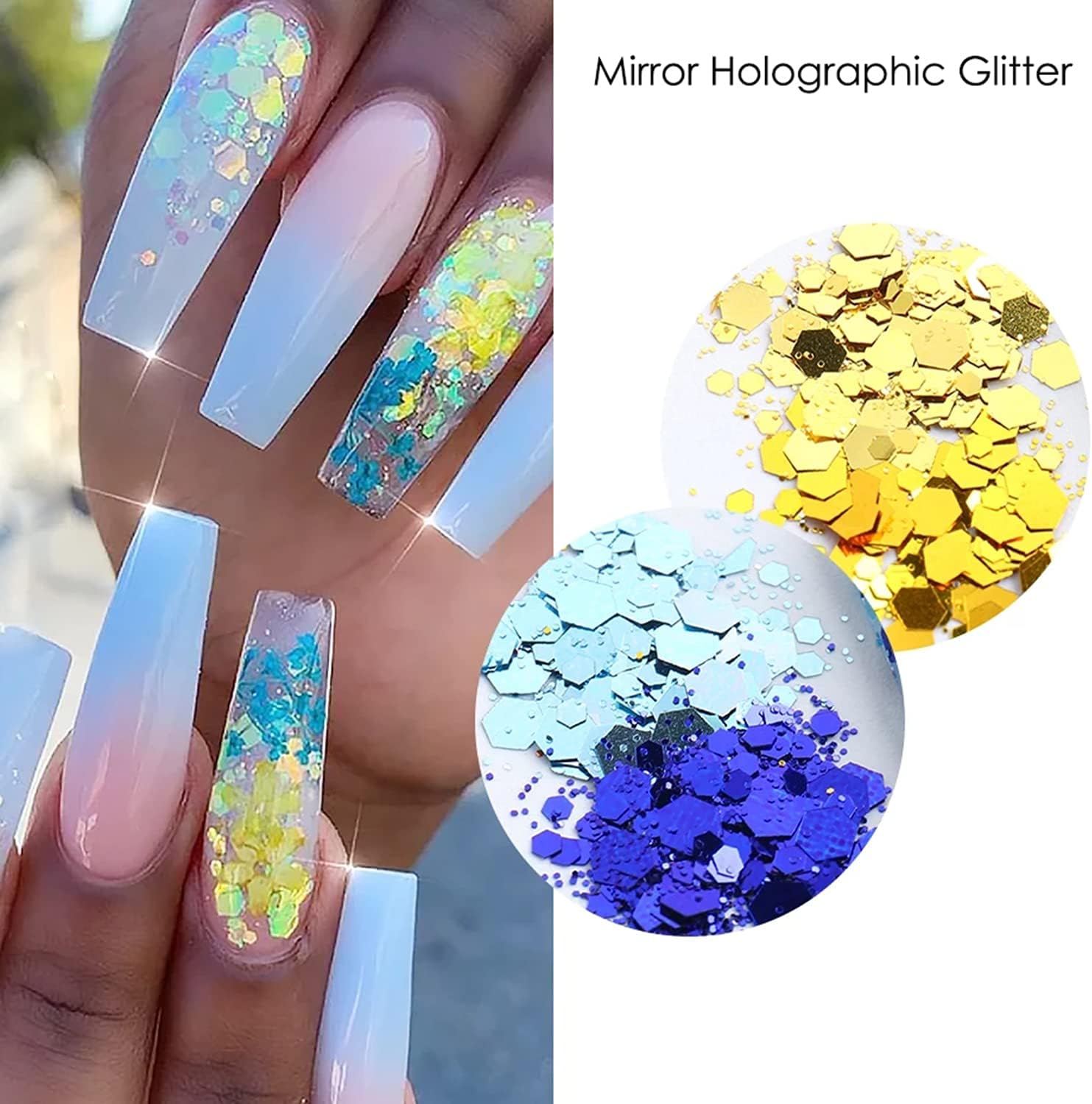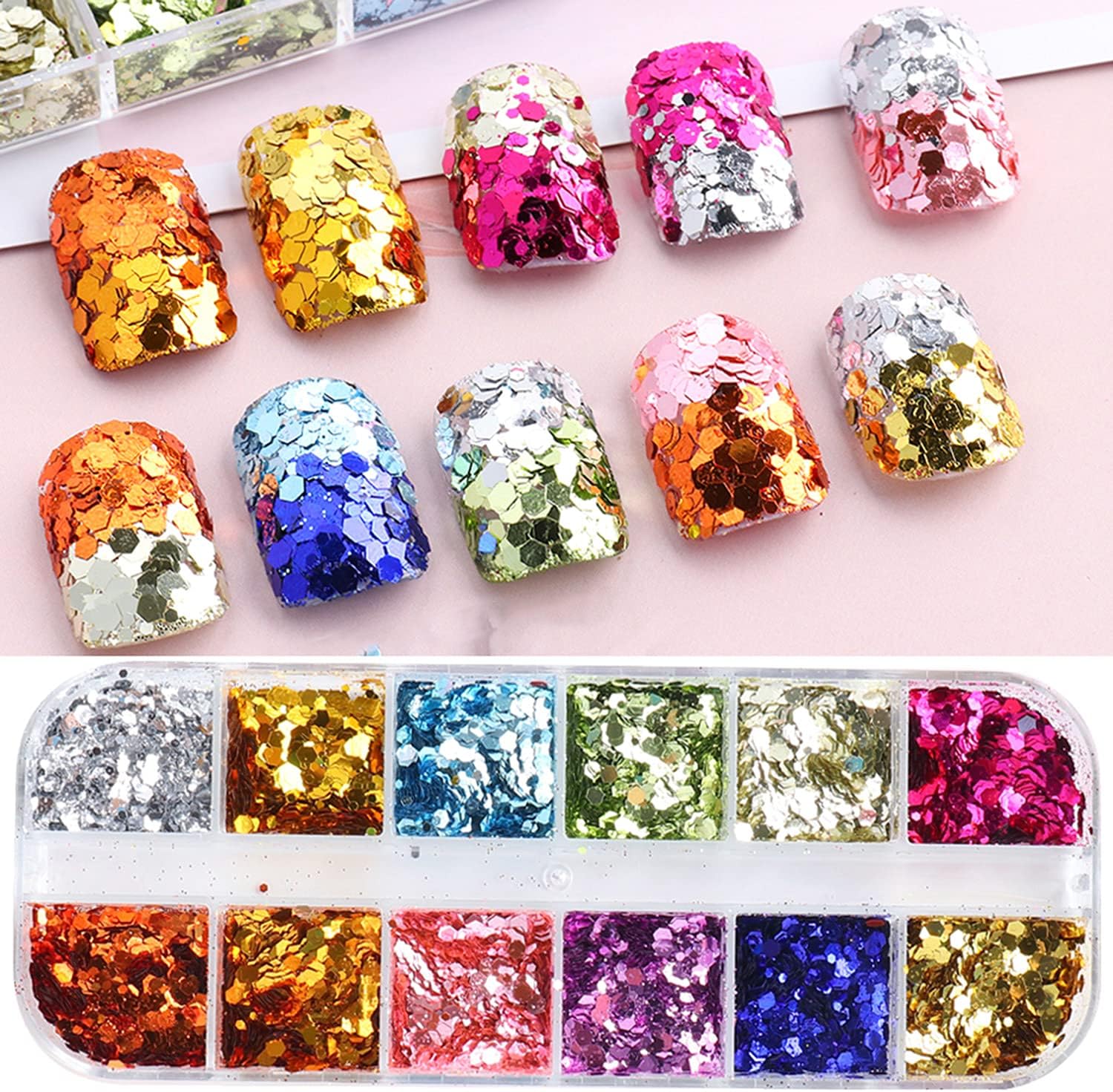- Nail Polish Kit: 12 Colors 3D mirror gradient hexagon nail glitter sequins, mixed size design, 12 small grids separate the packaging and prevent the product from spilling, which is convenient for your daily DIY nail decoration or body decoration.