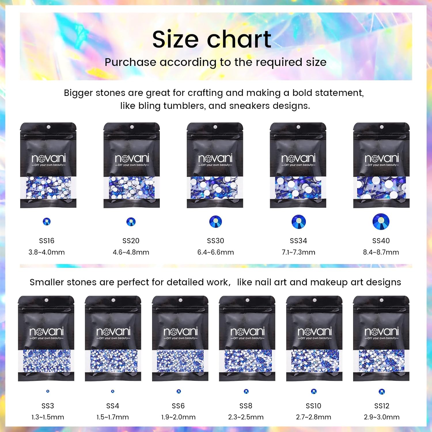 - Rhinestones for crafting: novani rhinestones are suitable for crafts, clothes, festival costumes, shoes, nail and face art, eye makeup, body art, bags, mobile phone cases, tumblers, cups, and other decoration needs