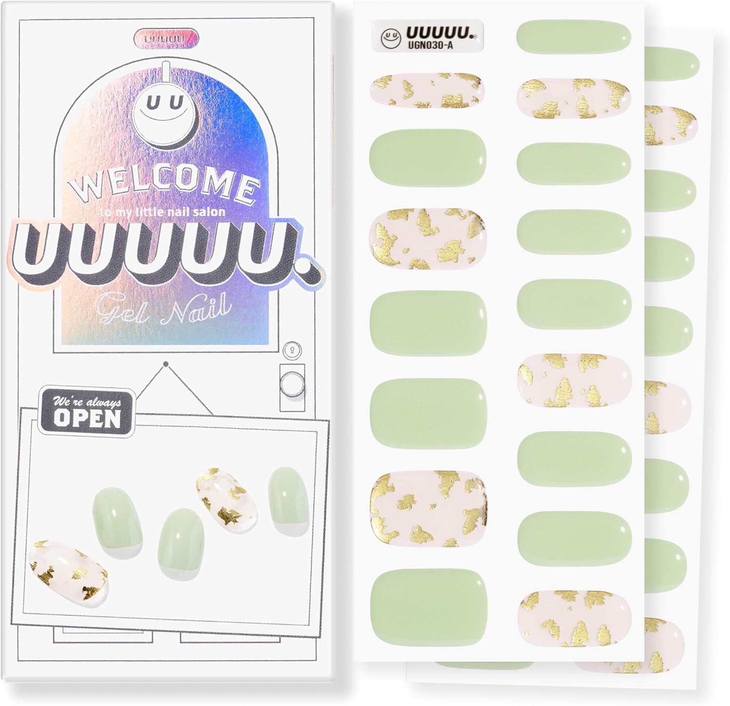 UUUUUU Semi Cured Gel Nail Strips | Salon-Quality | UV Free Gel Nail Wraps for Women | Easy Peel&Stick | Long-Lasting up to 14 Days | 28 Strips Set+File & Wipes | Gift-Ready (Green Gold Latte)