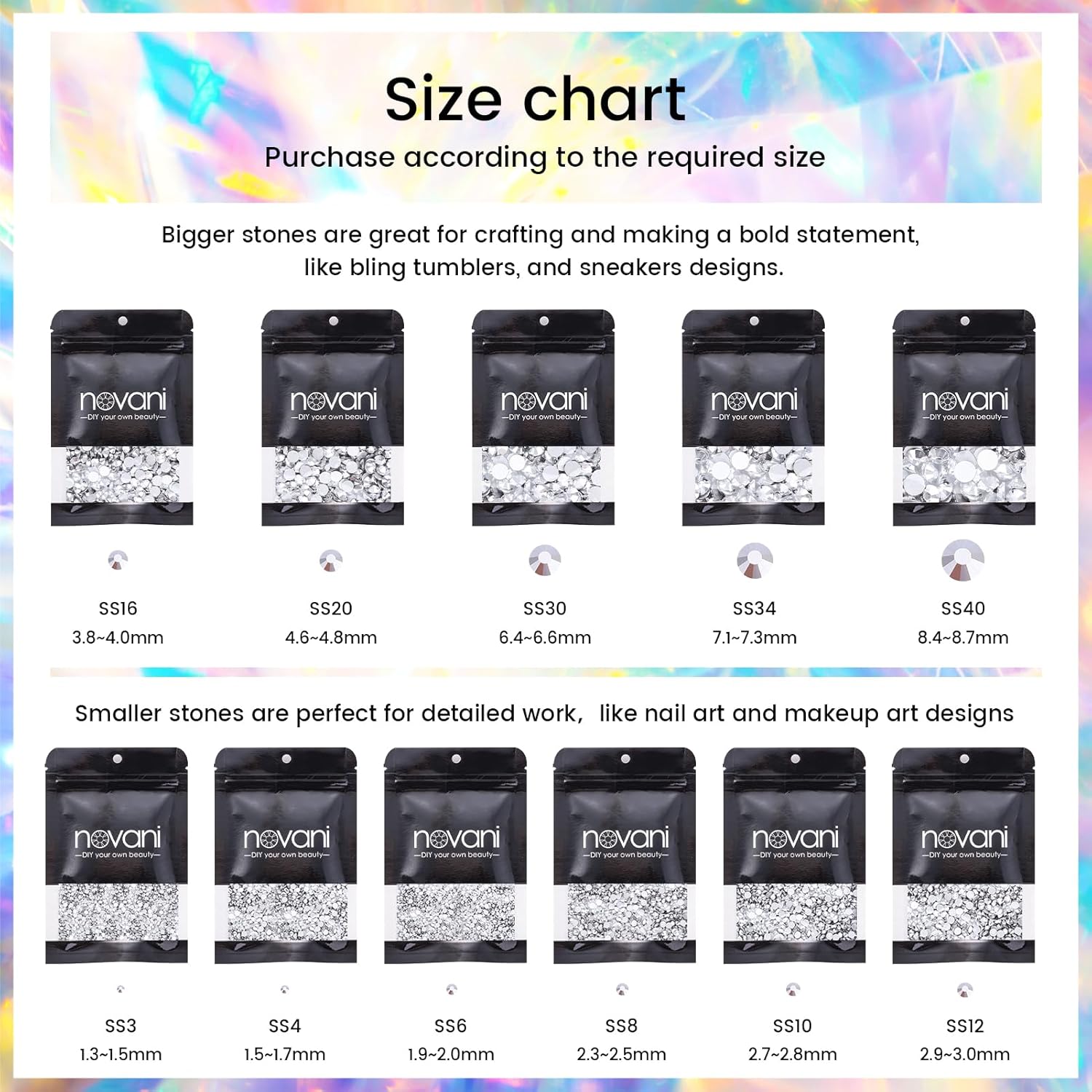 - Rhinestones for crafting: novani rhinestones are suitable for crafts, clothes, festival costumes, shoes, nail and face art, eye makeup, body art, bags, mobile phone cases, tumblers, cups, and other decoration needs