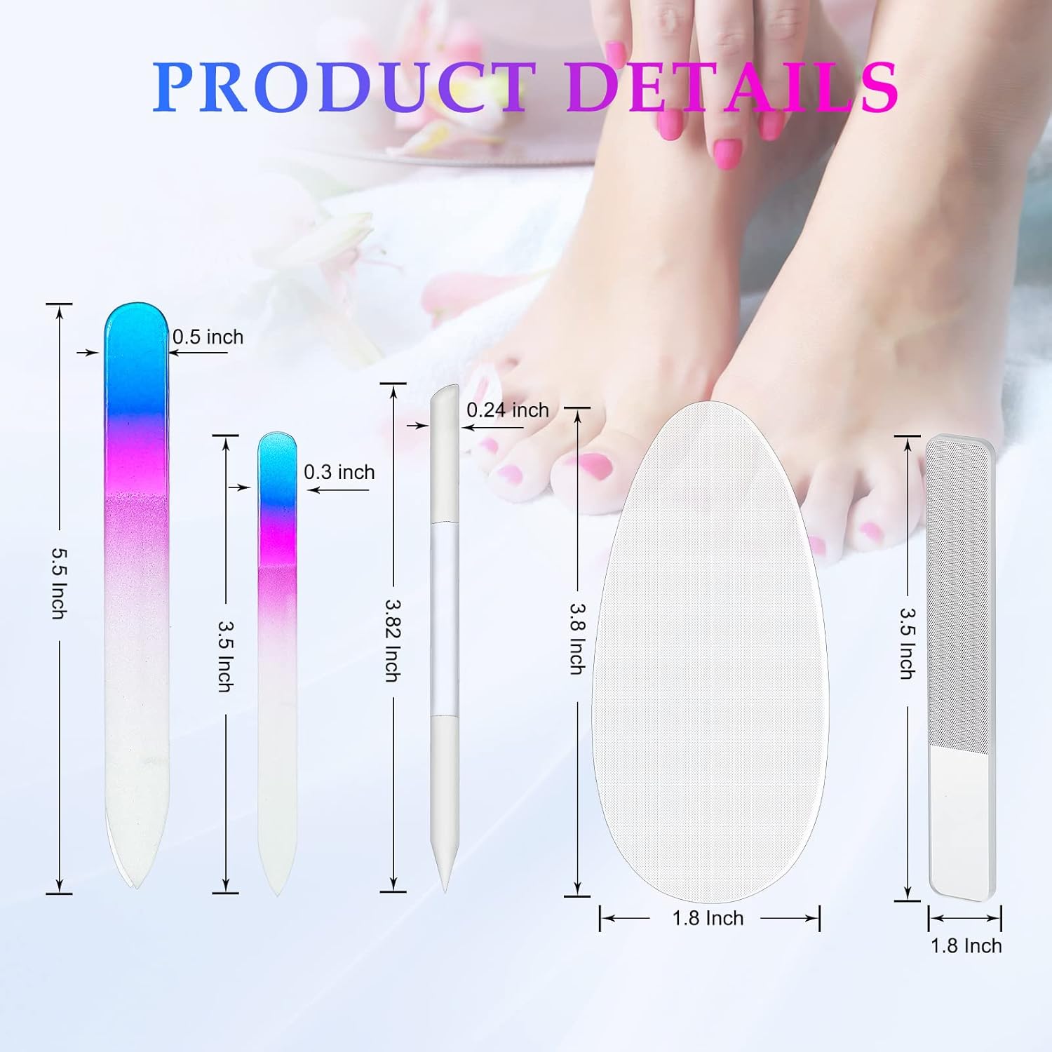 - What You Get: you will receive 2 pieces gradient color glass nail file, 2 pieces nano polished glass nail file, 1 piece nano foot scrubber callus remover, 1 piece cuticle trimmer, sufficient in quantities and styles to meet your daily demand
