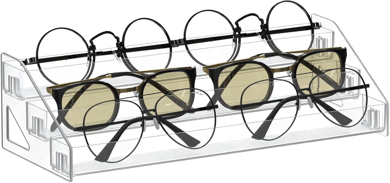 - 3-Layer Acrylic Sunglasses Holder, Can hold up to 6 pairs of sunglasses. Each layer is 11.8 inches long and 1.44 inches wide, a total of 3 layers.