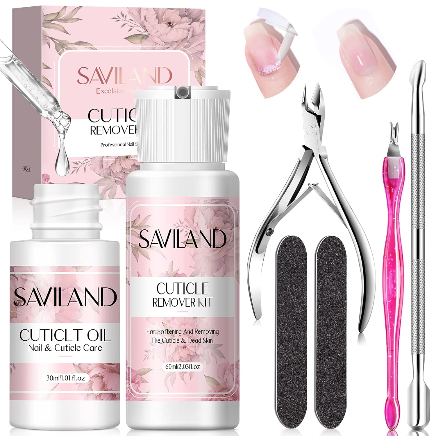 - PROFESSIONAL & COMPLETE CUTICLE REMOVER KIT: Saviland cuticle remover kit contains 60 ml/2.02 fl oz cuticle remover cream, 30 ml/1.01 fl oz cuticle oil, cuticle trimmer, cuticle pusher, cuticle fork, which can provide you for nail care with everything. Not only will it help you remove dead skin/cuticle, but it will also bring salon-like professionalism and comfort to your nail care. Make your daily nail care easy and convenient at home.