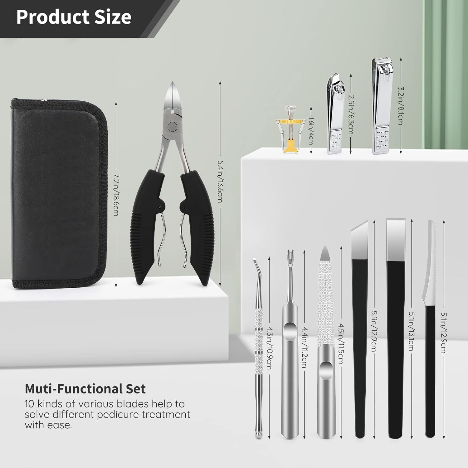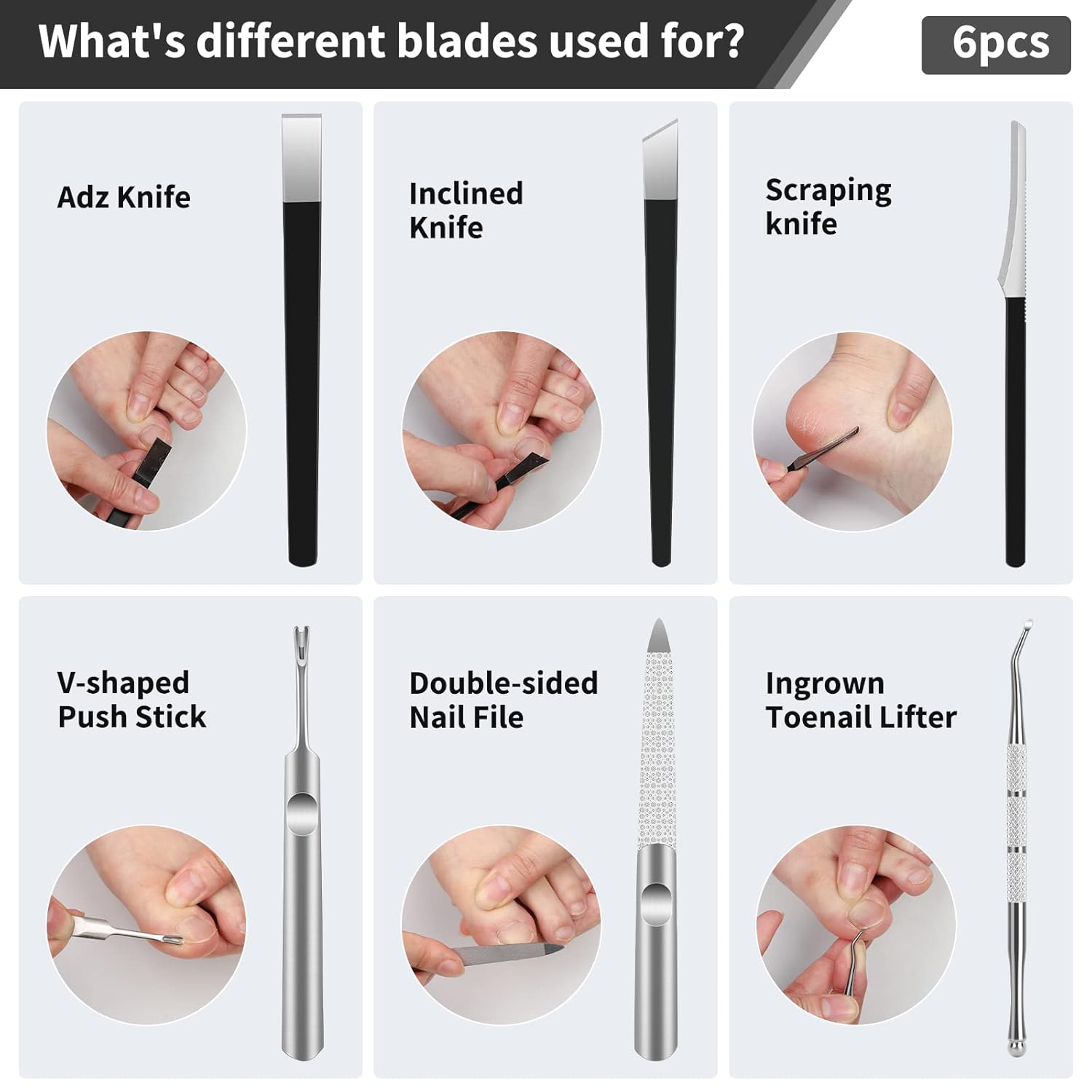- 【Muti-Functional Set】10 kinds of various blades help to solve different pedicure treat-ment with ease. Product list: 1*adz knife, 1*scraping knife, 1*inclined knife, 1*large nail clipper, 1*diagonal nail clipper, 1*V-shaped push stick, 1*double-sided nail file, 1*ingrown toenail lifter, 1*toenail clipper, 1*toenail corrector, 1*PU storage bag.