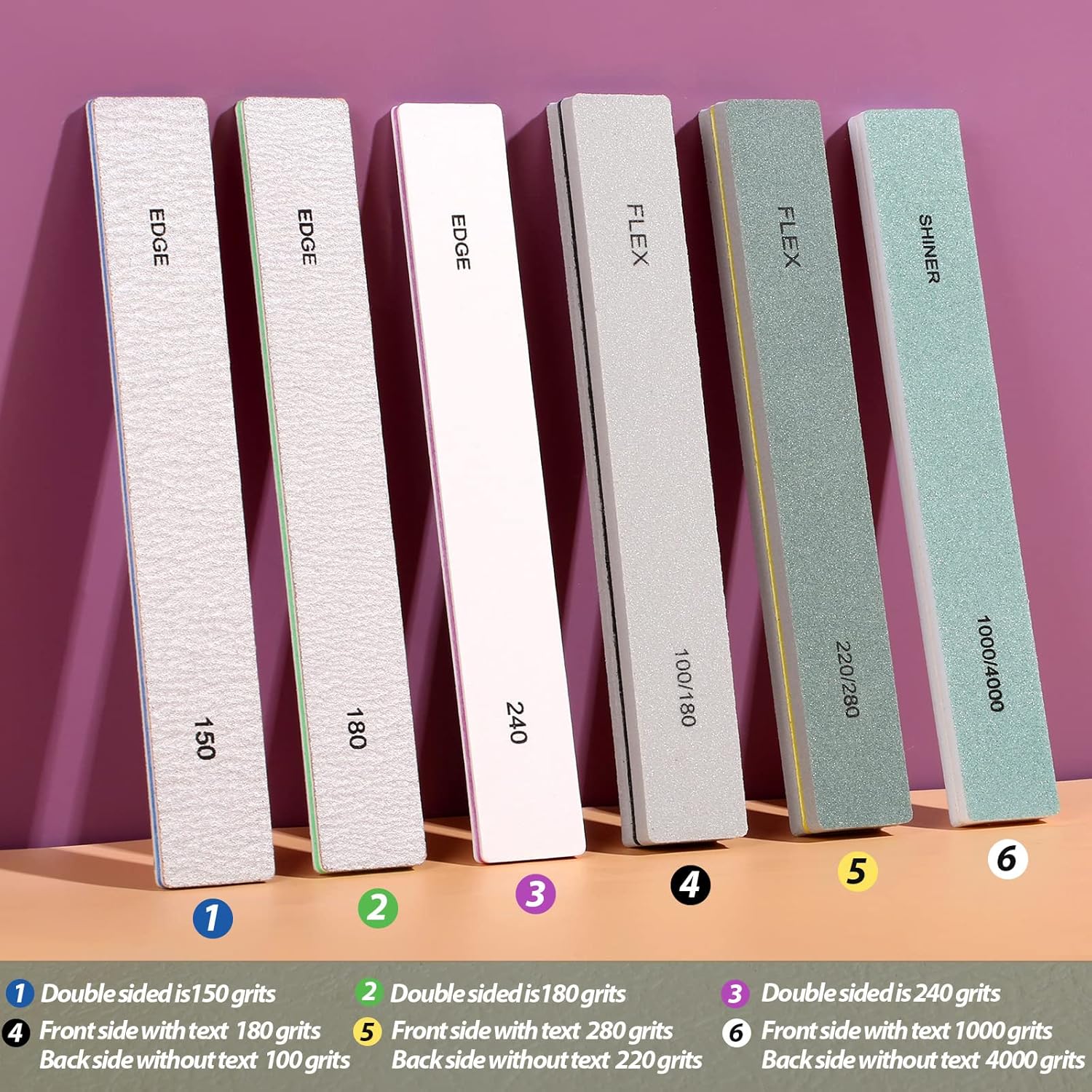 - 150/180/240 Nail Files for Acrylic and Gel Nails & Natural Nails: File - Start with this STEP 1 to trim your nails to desired length or shapes like Oval, Square, Squoval, Round, Almond, fit for fingernail & toenail. You can also use them to remove top coat of gel nails and acrylic nails(Tips: 150 grit is rough, 180 grit is medium and 240 grit is fine)