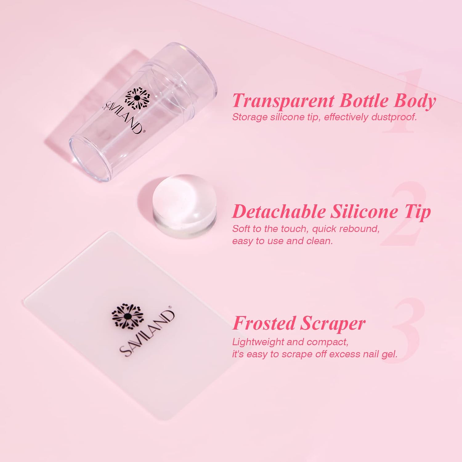 - Easy To Clean: Saviland nail stamping kit is made of upgraded silicone material, it is more durable, scratch-resistant, softer, and will not leave scratches and marks after pressing. Can be used up to 100 times. Use the included cleaning pad to quickly clean the french nail art stamper