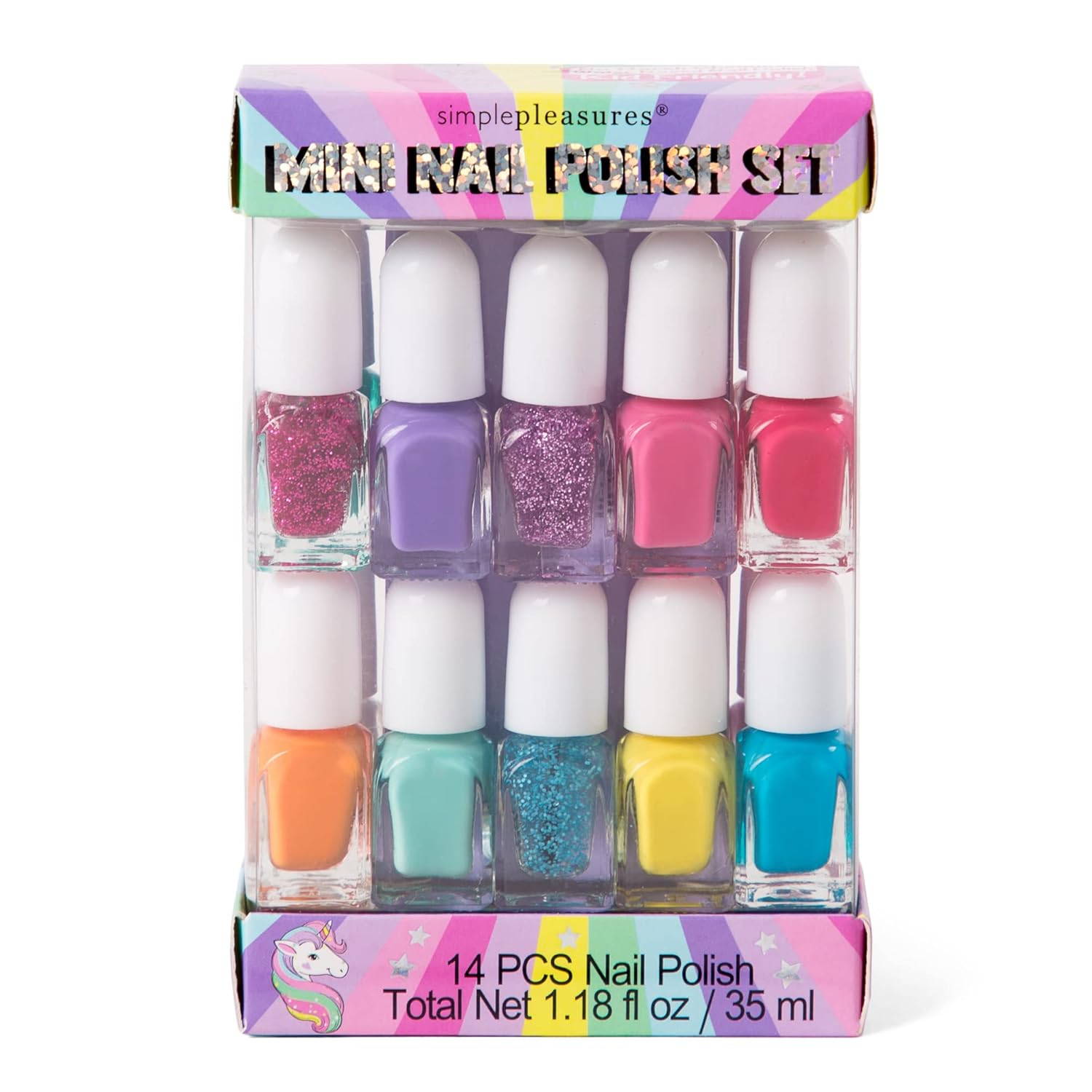 SIMPLE PLEASURES Unicorn Rainbow Kids Nail Polish Set for Girls – 14 Water-Based Non -Toxic Nail Art Kit - Gift Set for Ages 7-12