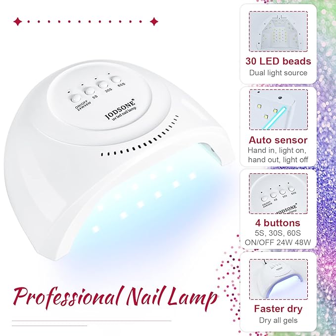 - Smart Nail Lamp: This manicure lamp has 30 small led beads, which can cure every finger comprehensively. Large space, you can put two hands at a time. And it has three curing modes, 5 seconds, 30 seconds and 60 seconds. Generally, under normal circumstances, gel nail polish can be quickly cured within one minute. But the cure time also depends on the amount of gel nail polish. With the nail lamp and correct operation, gel nail polish generally lasts for about 21 days..