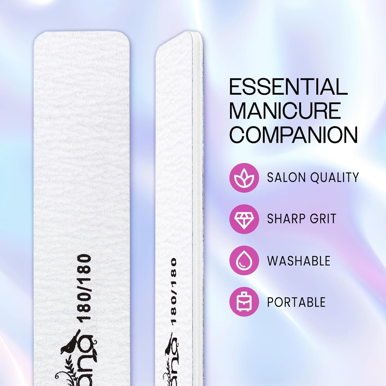- [Uses] These nail files are ideal for shaping and smoothing natural and acrylic nails. The effective grit allows for quick reduction of length and thickness, while also refining edges with precision.