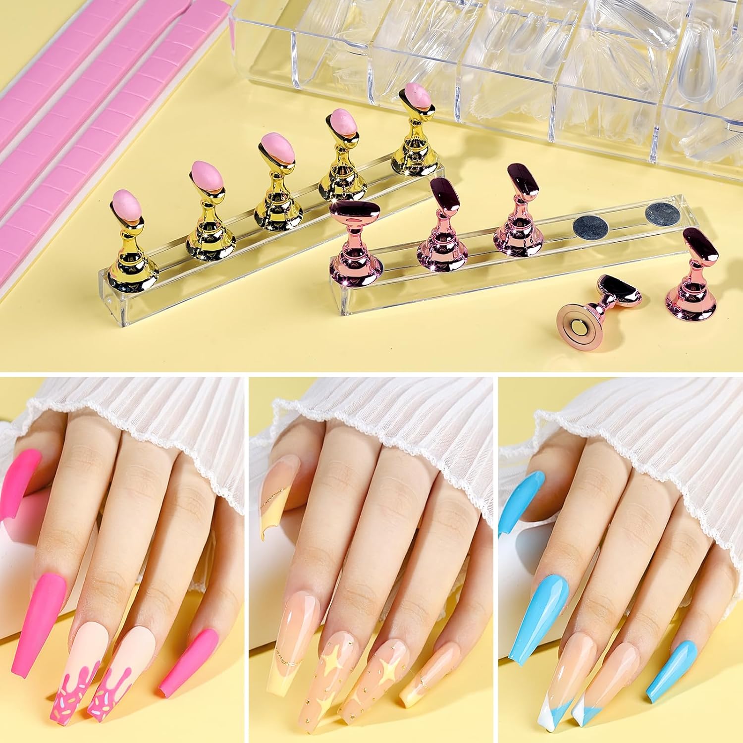 - Press On Nail Starter Kit: 2 set nail stands with putty, 600pcs clear coffin nail tips full cover available in 10 different sizes, each nail tip is individually numbered, easy to choose. Whether you want short coffin nails, medium or long coffin nails, you can use acrylic nail clipper to get them to a desirable length. If you have nail polish colors, You can use this kit to practice with or create your own press on nails and apply these fake nails with our brush on nail glue.