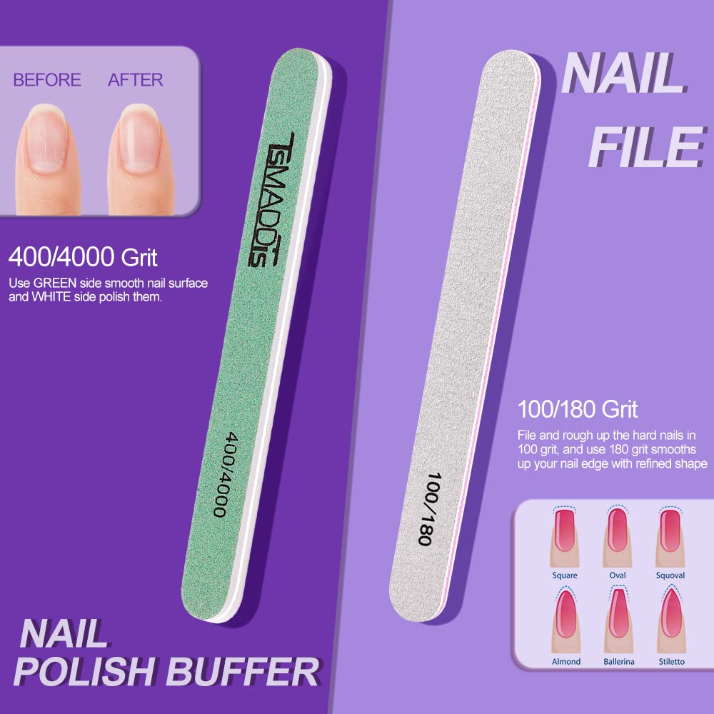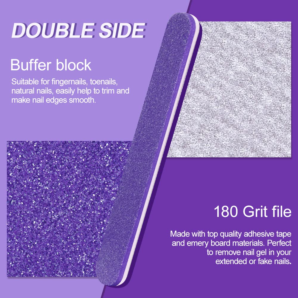 - Nail Files & Nail Polishing Buffers: Double sided files 100/180 can file and rough up the hard fingernails and toe nails in 100 grit, and use 180 grit smooths up your nail edge with refined shape. Nail Polishing Buffer:400 grit green side can refine nail surface and 4000 grit white side helps to smooth nail surface. The buffer block and files are suitable for polishing uneven nail surface to make your nails smooth