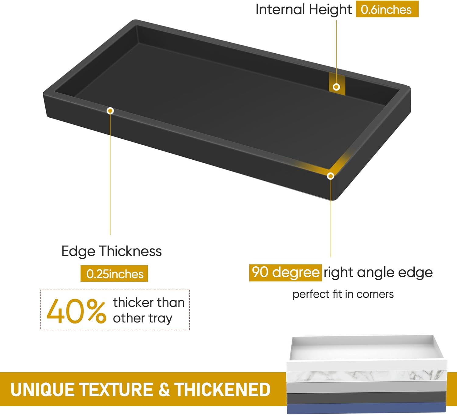 - 【Premium/Upgrade Silicone】Our vanity tray have an upright 90°edge, which fits perfectly in the corner or counter edge. After research, we increased the overall thickness of the bathroom vanity tray by 40%, improving the stability of the tray for bathroom countertop.Silicone trays are waterproof, do not discolor or peel, are heat resistant, reusable. Toilet tank tray is easy to clean and store and can be brushed or dishwasher cleaned.