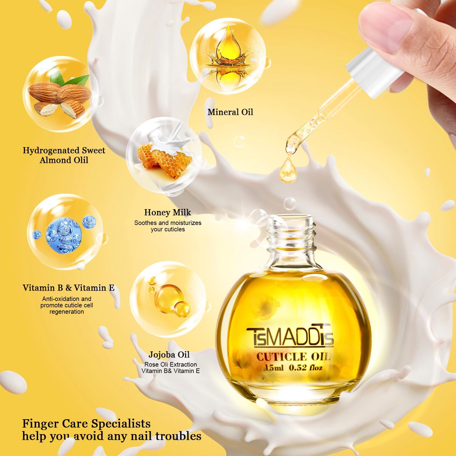 - Nail Cuticle Oil: 15ml/bottle, includes 100% pure jojoba oil, natural vitamin b& vitamin e, natural milk and honey oil extraction and sweet almond oil which can relieve nail oxidation. Natural extract to keep the stratum corneum moist. Absorbs quickly into nails and cuticles to deeply hydrate. Cuticle oil is enriched with a unique complex of natural vitamins and oils to effectively reduce epidermal wrinkles and nails and promote healthy nail growth.