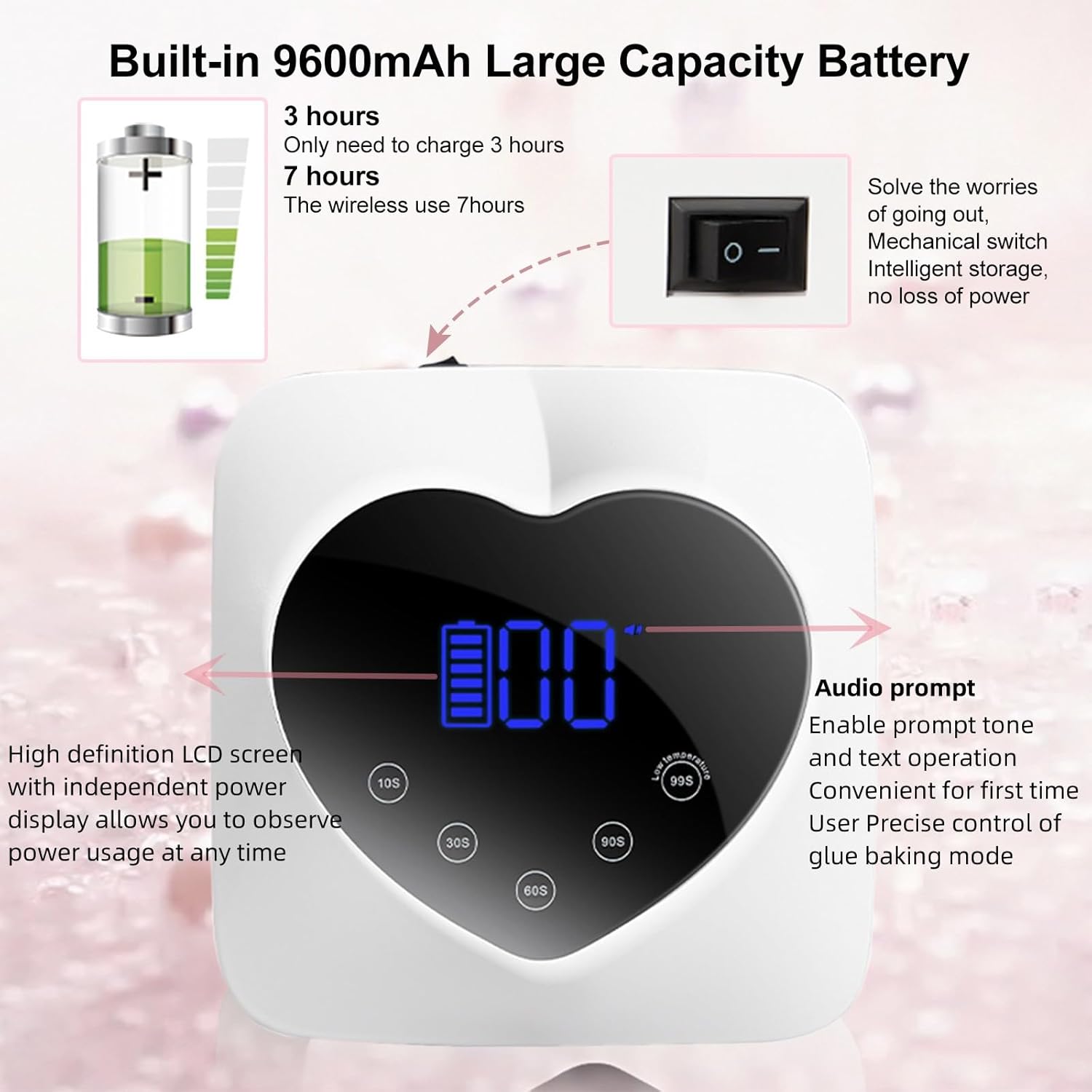 - Large LED Touch Screen Digital Display & 5 Timer Setting: The nail lamp with Large heart-shaped screen displays curing time and battery charge, 5 timer settings for your choosing(10S / 30S/ 60S / 90S / 99S low temperature mode ) and made a voice-activated reminder button. The 99S is low heat mode, with gradually increasing power to relieve the burning sensation caused by glue baking and bring you a comfortable salon manicure experience.