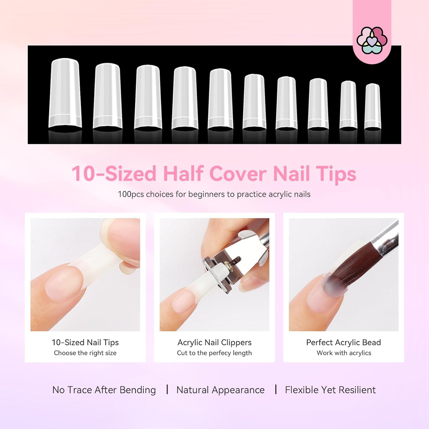 - 100 Nail Tips & 12-Color Glitter for Practice:The acrylic nail kit includes 100 nail tips and 12-color glitter for practice. The 10-sized tips offer beginners choices to practice acrylic nails. These nail tips are flexible yet resilient, providing a natural appearance with no trace after bending. The 12-color nail art glitters allow users to unleash their creativity with sparkling and shining effects.