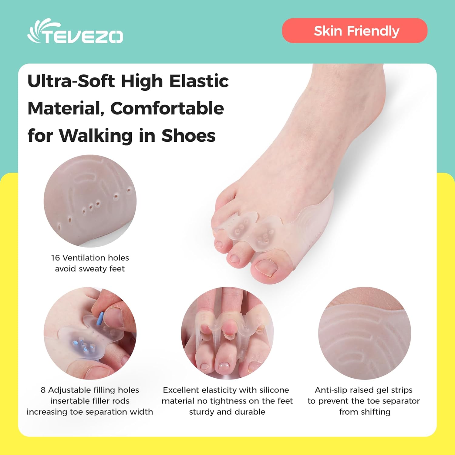 - 🌟 Comfort and Durability: Crafted from soft, skin-friendly silicone, our toe separators are not only comfortable but also highly elastic, ensuring they won't constrict your feet. They're designed to last, providing long-term bunion relief and toe alignment.