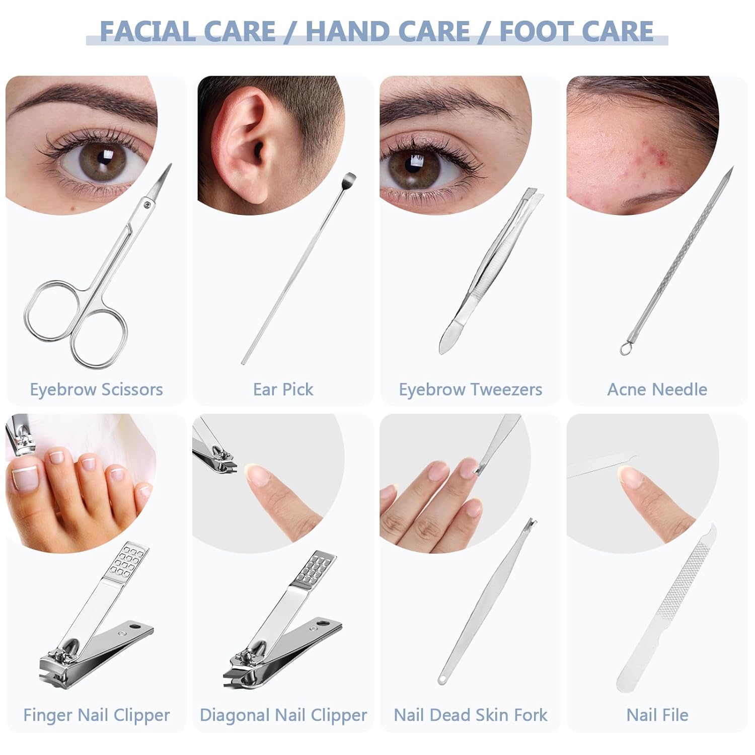- 8 in 1 Manicure Set: this thank you manicure kit is a comprehensive package for professional nail care; Each package contains 24 sets of nail grooming kits, each set has 8 tools including various manicure, gromming and pedicure tools like nail clippers, tweezers, scissors, cuticle trimmers to facial care tools, enough for your daily hand, facial and foot care needs