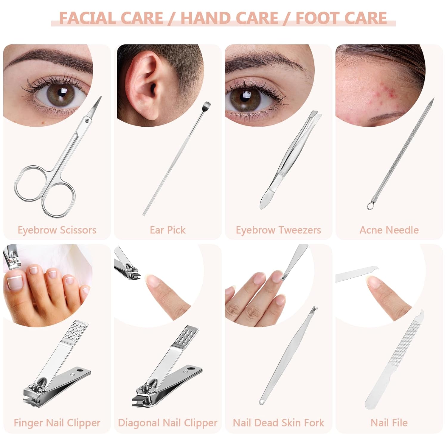 - 8 in 1 Manicure Set: this thank you manicure kit is a comprehensive package for professional nail care; Each package contains 24 sets of nail grooming kits, each set has 8 tools including various manicure, gromming and pedicure tools like nail clippers, tweezers, scissors, cuticle trimmers to facial care tools, enough for your daily hand, facial and foot care needs