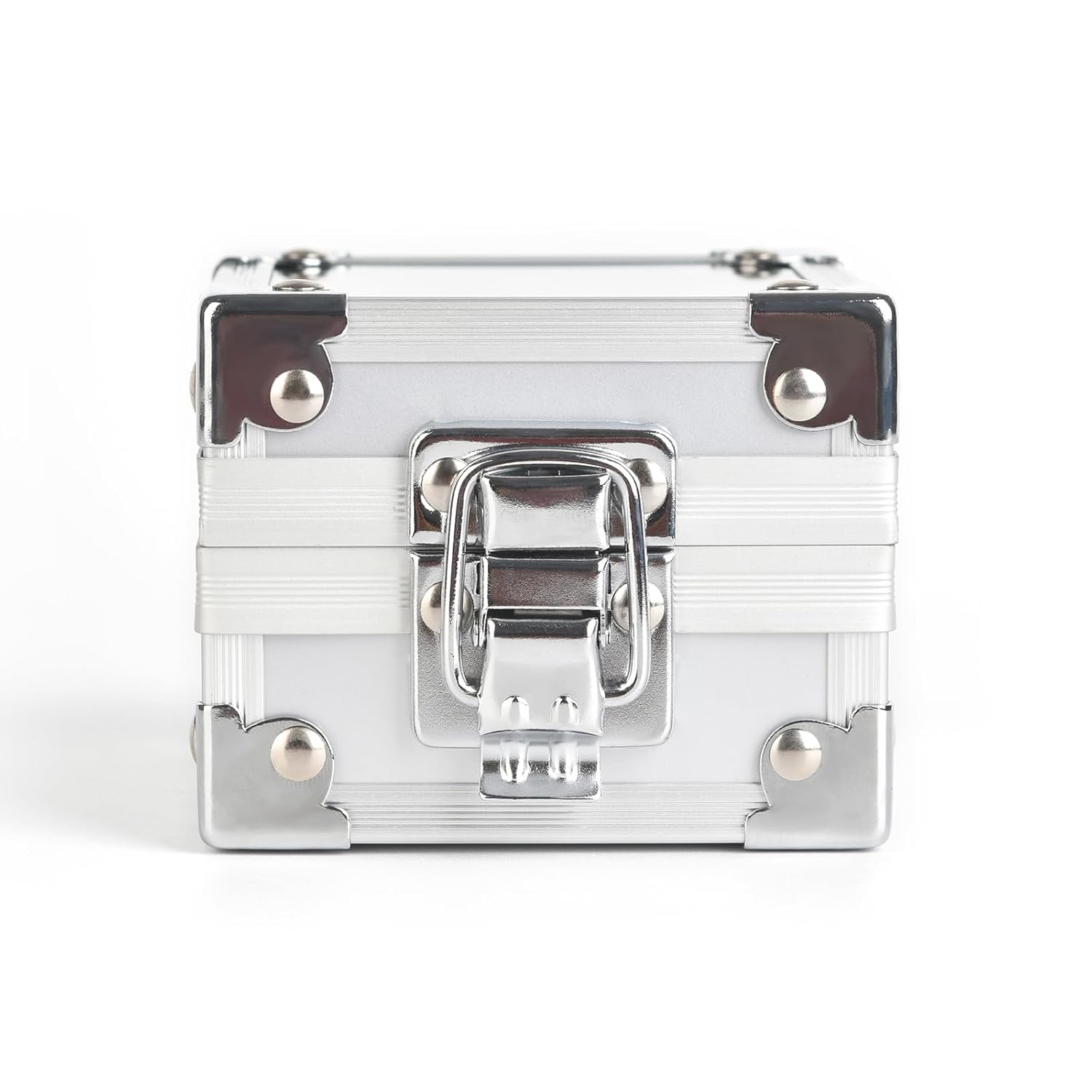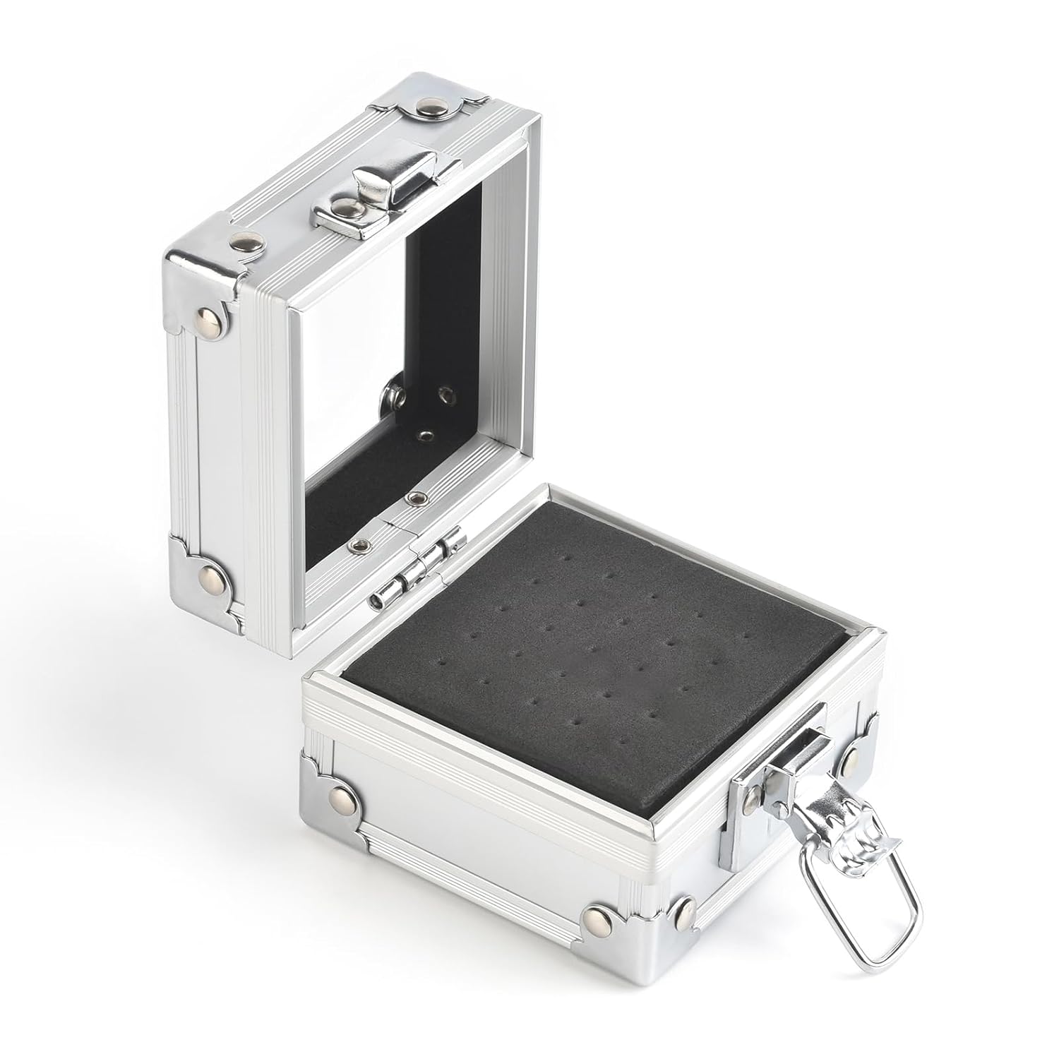 - 【Quality Material】-- Made of the high quality Aluminum material, which is safe, environmental and durable. Nail polisher storage box holds up to 25 drills and transparent cover makes it easy to find your nail pieces to look at. The size: 7.8 x 9.1 x 6cm / 3.1 x 3.58 x 2.4 inch.
