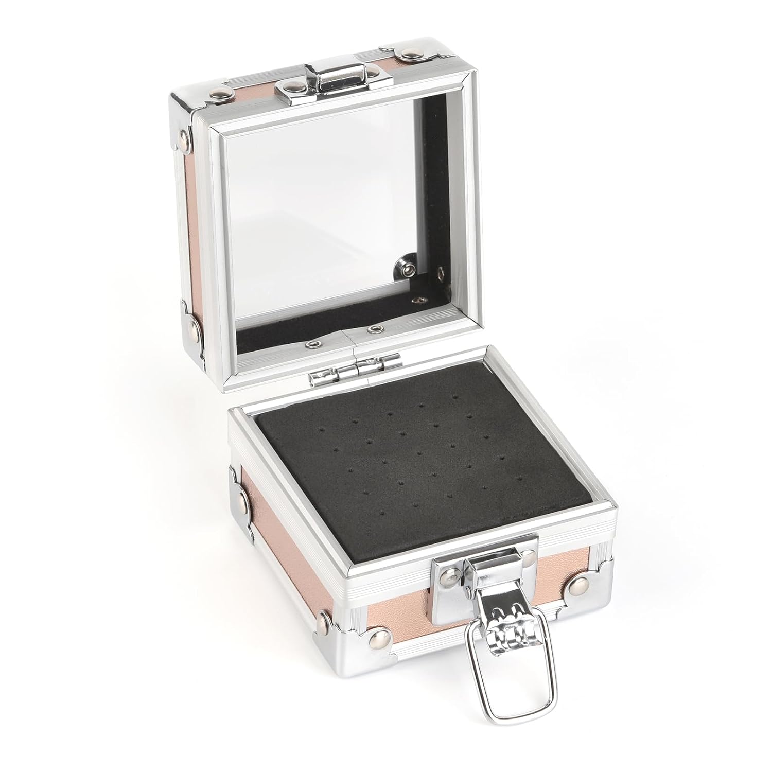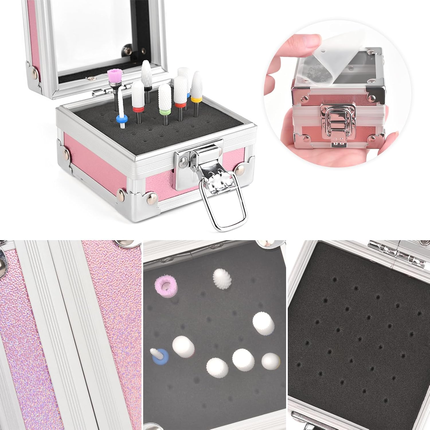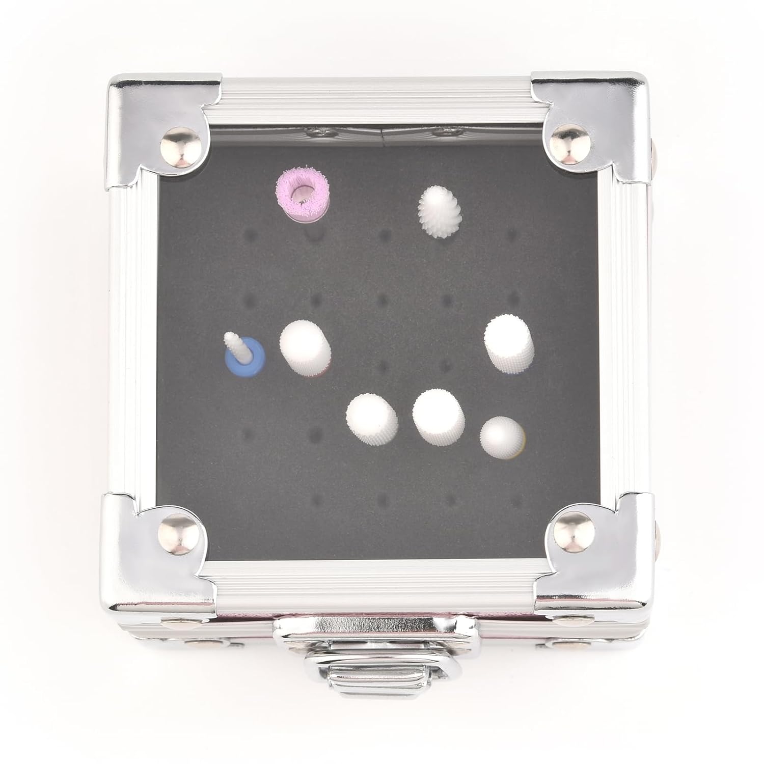 - 【Quality Material】-- Made of the high quality Aluminum material, which is safe, environmental and durable. Nail polisher storage box holds up to 25 drills and transparent cover makes it easy to find your nail pieces to look at. The size: 7.8 x 9.1 x 6cm / 3.1 x 3.58 x 2.4 inch.