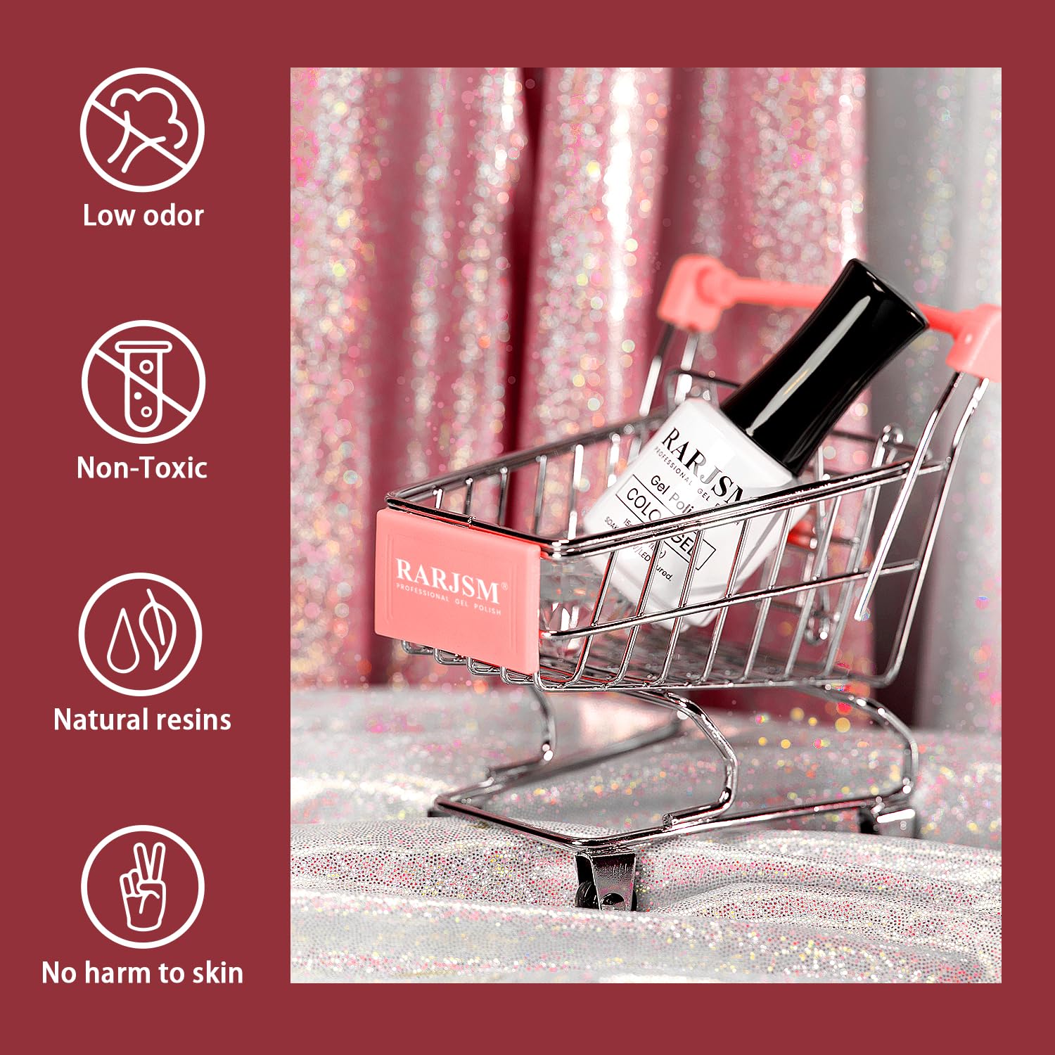 - RESIN FORMULA:RARJSM big flakes glitter nail gel polish is made of natural resin, non-toxic formula.It’s a highly-pigmented, long-lasting polish that won’t chip or smudge.No harsh ingredients or adhesives with low smell, rich color, middle consistency, self-evenly, no shrink and edge