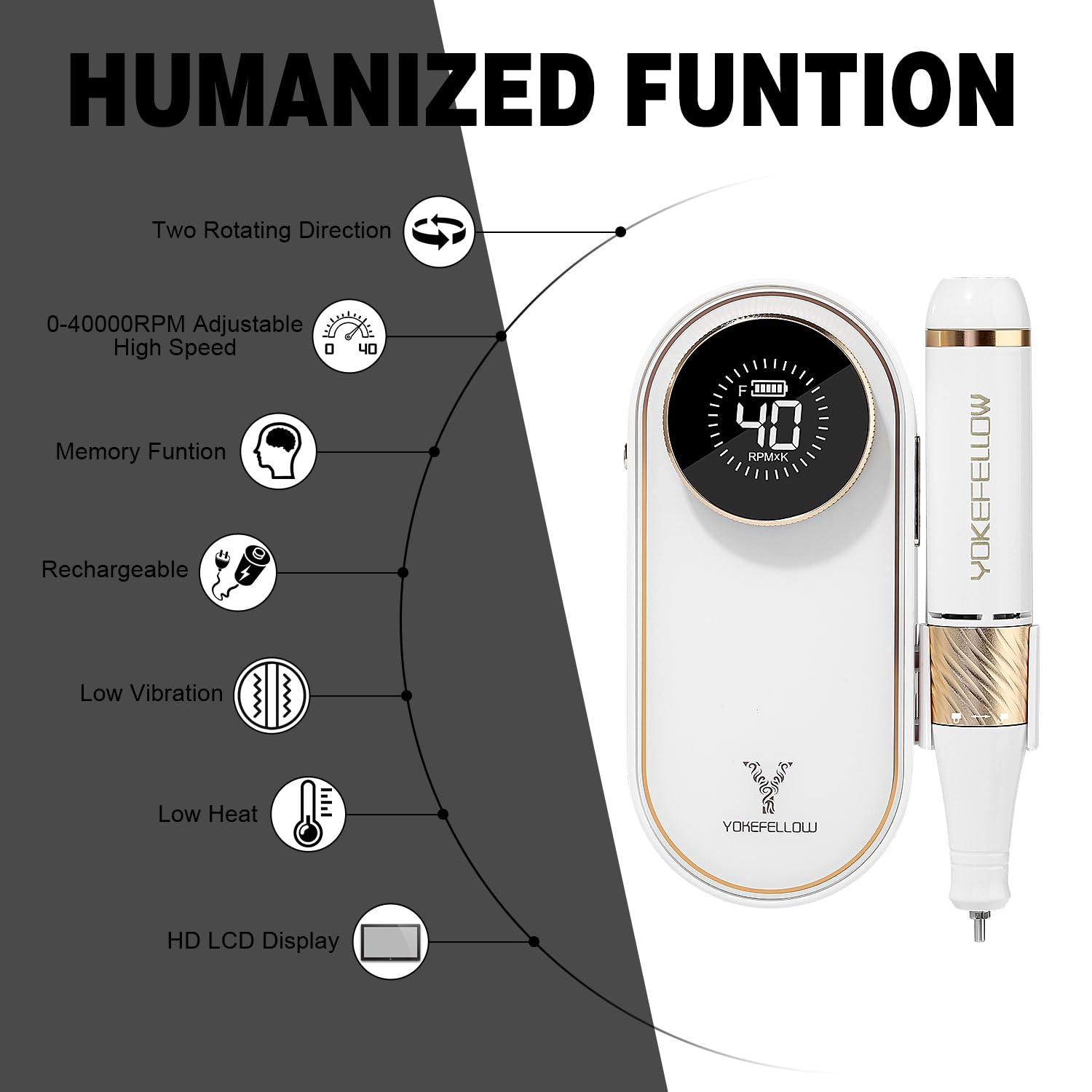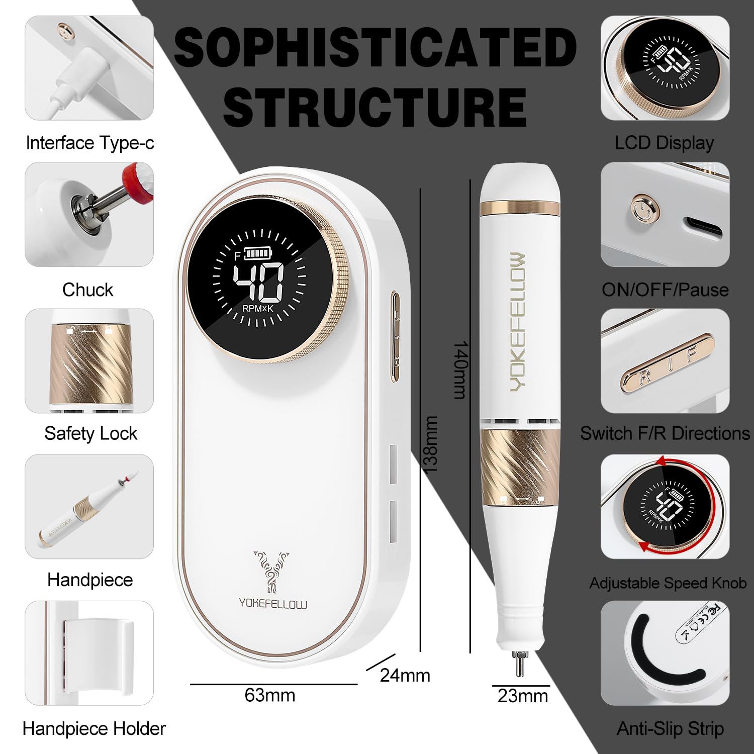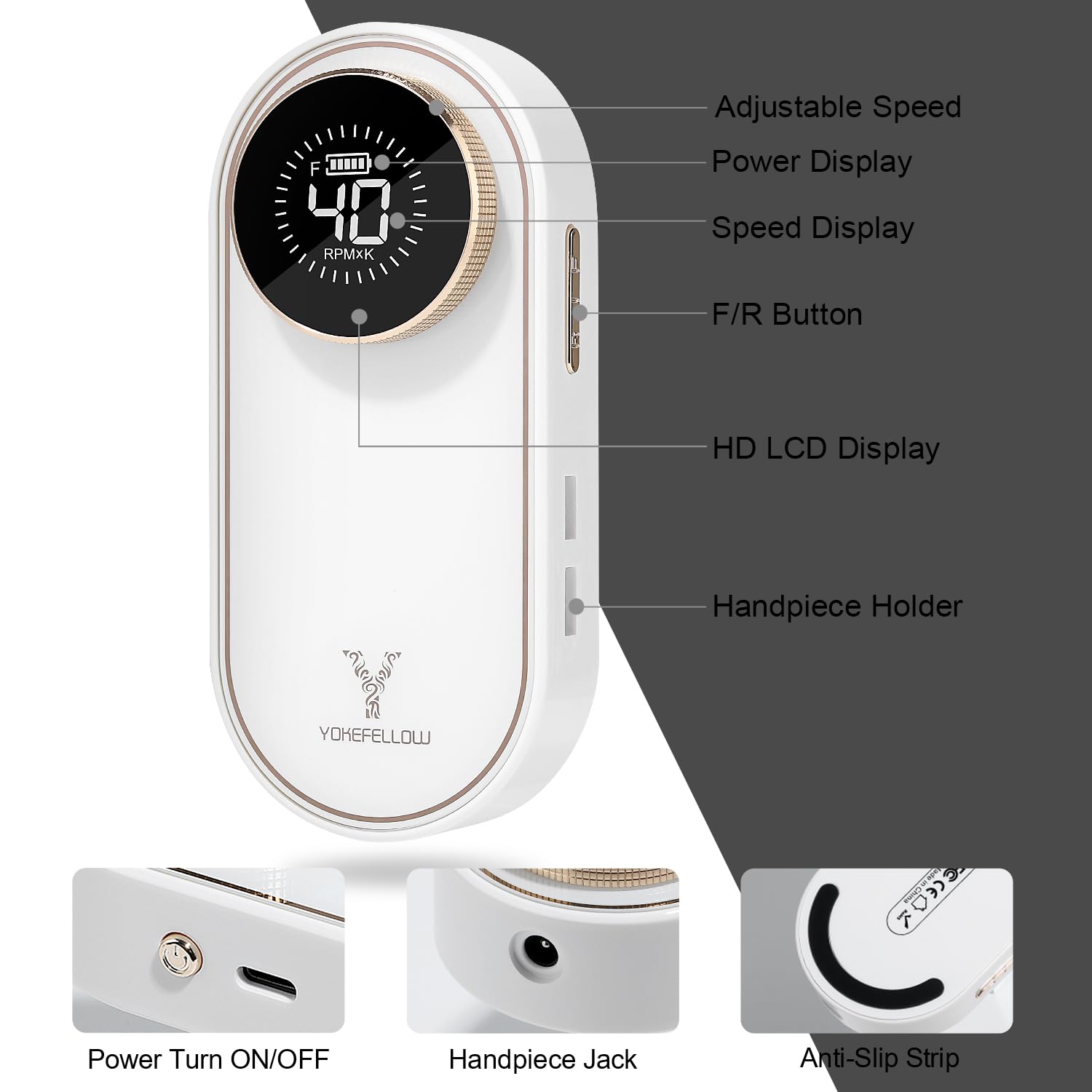 - [HD LCD Display]: Equipped with touch-sensitive buttons are integrated with the body of the efile nail drill, it is very easy and convenient to use. The smart LCD Display show clearly RPM and accurate battery for you.