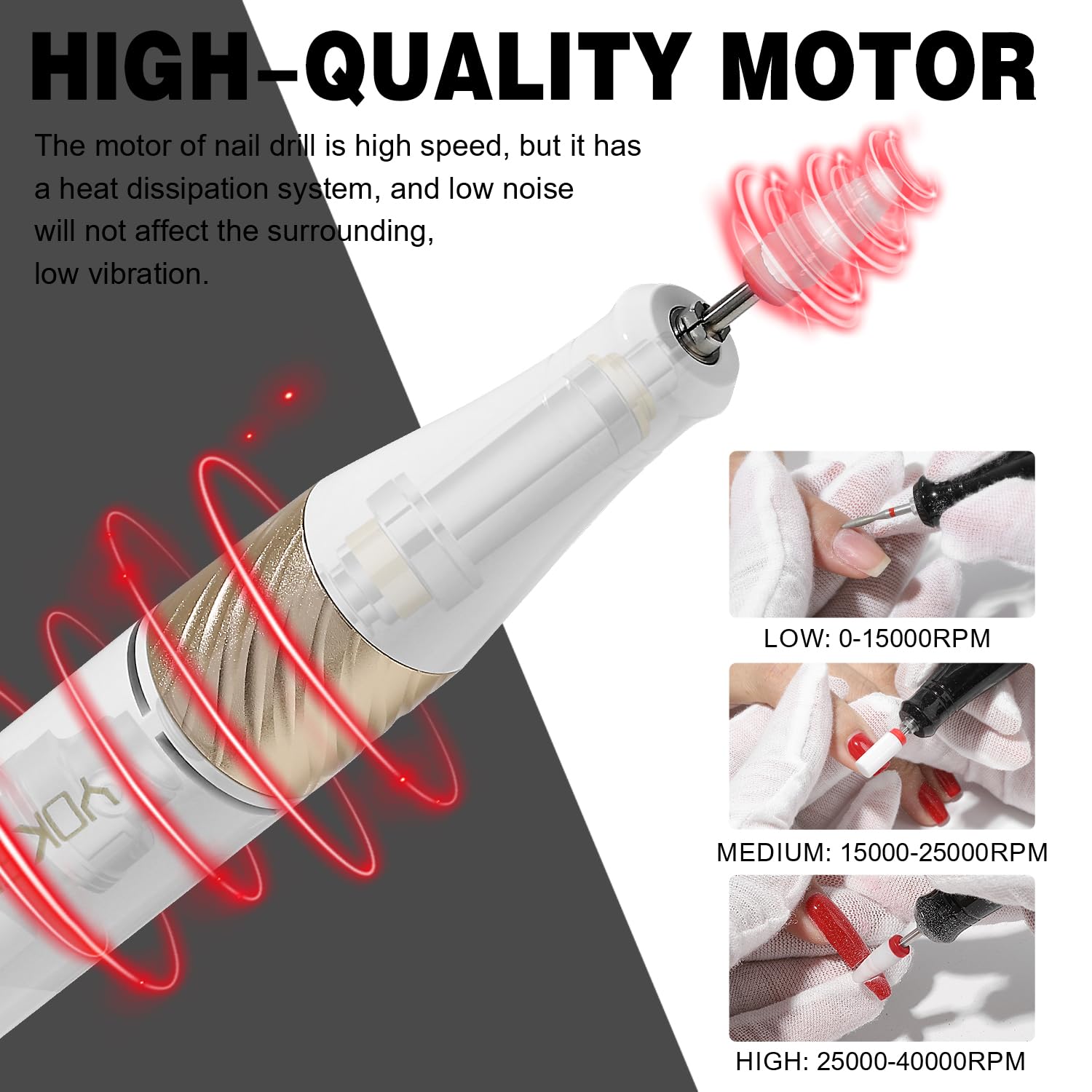 - [Speed control]:0-15000RPM is good for removing dead skin and cutincl,grinding,shaping and polishing natural nail .15000-25000 RPM is good for removed the gel nail polish.25000-40000RPM is for acrylic nails and more professional manicures in a nail salon