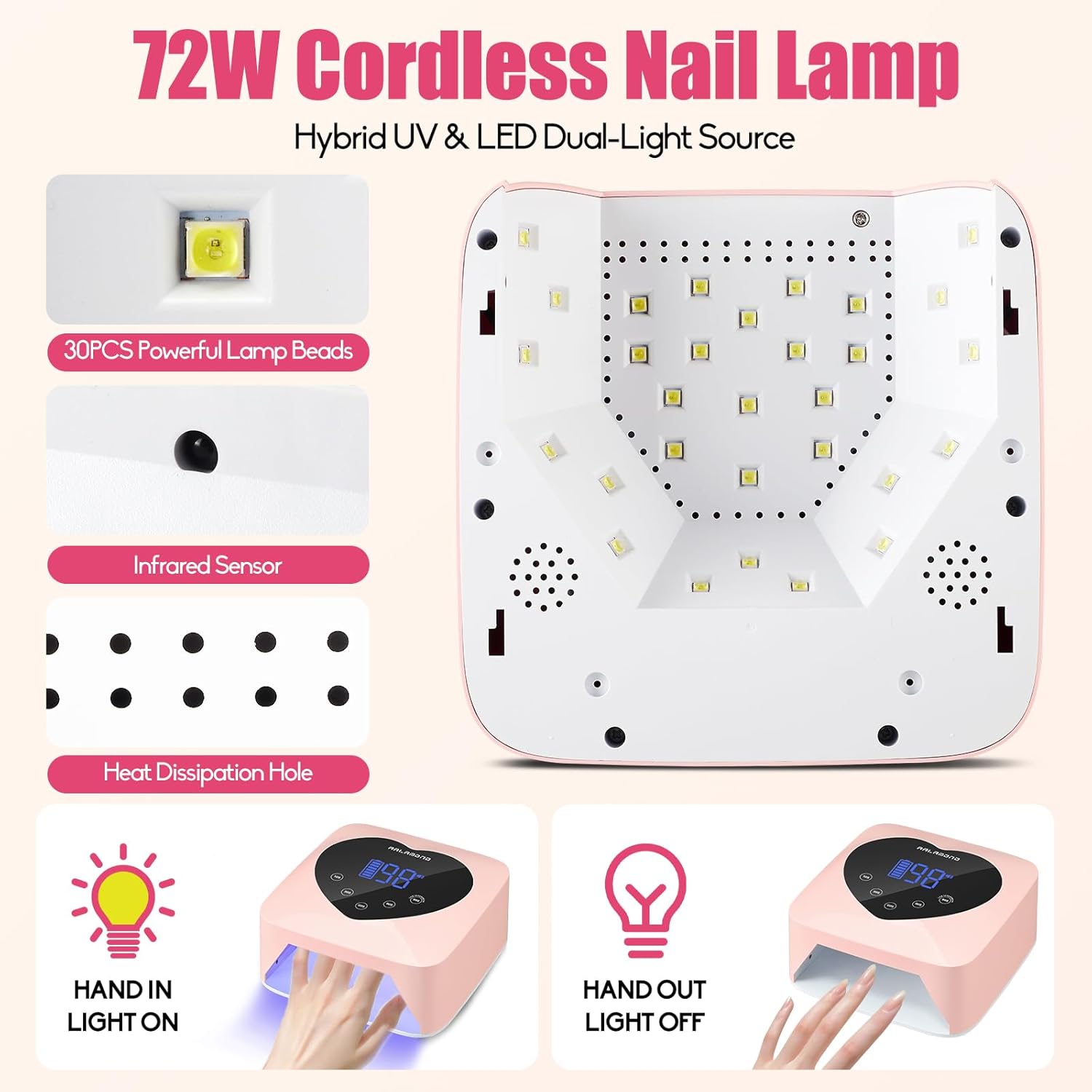 UV LED Nail Lamp, 72W Cordless UV Light for Nails, Rechargeable Nail Dryer with 5 Timer & Auto Sensor, Professional Fast Curing Gel Nail Lamp with Large Touch Display (Pink)