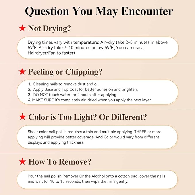 - Smooth, Easy To Use: The water-based nail polish is easy to apply and dried well, don't need any other UV/LED Nail Lamp; Whether you prefer a glossy or chic matte top coat for a smooth finish, designed for convenient at-home nails and salon manicures