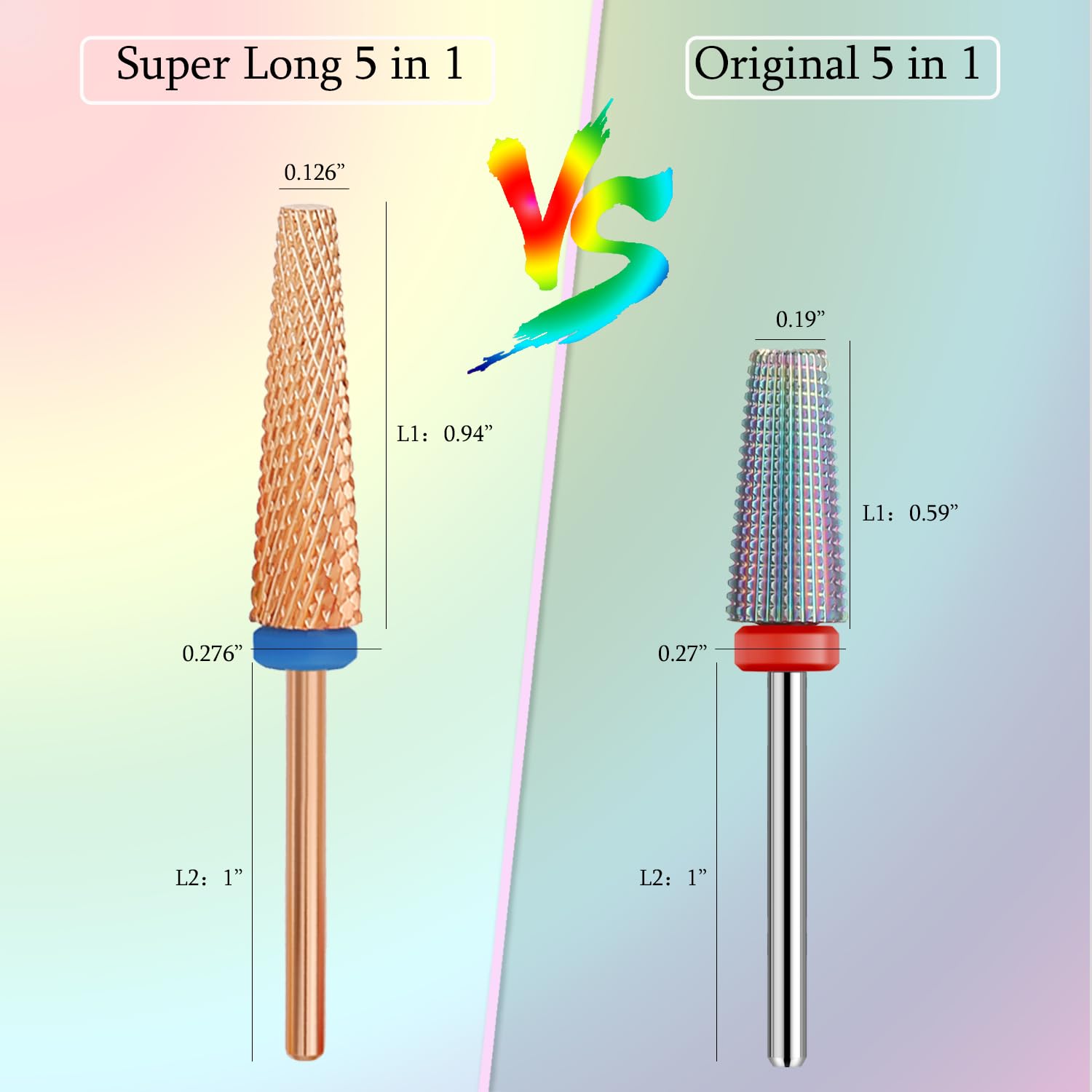 - ● Super Long 5 in 1 Nail Drill Bit: Our nail drill bit is designed to meet all your nail grooming needs - cuticle cleaning, shaping, and polishing.