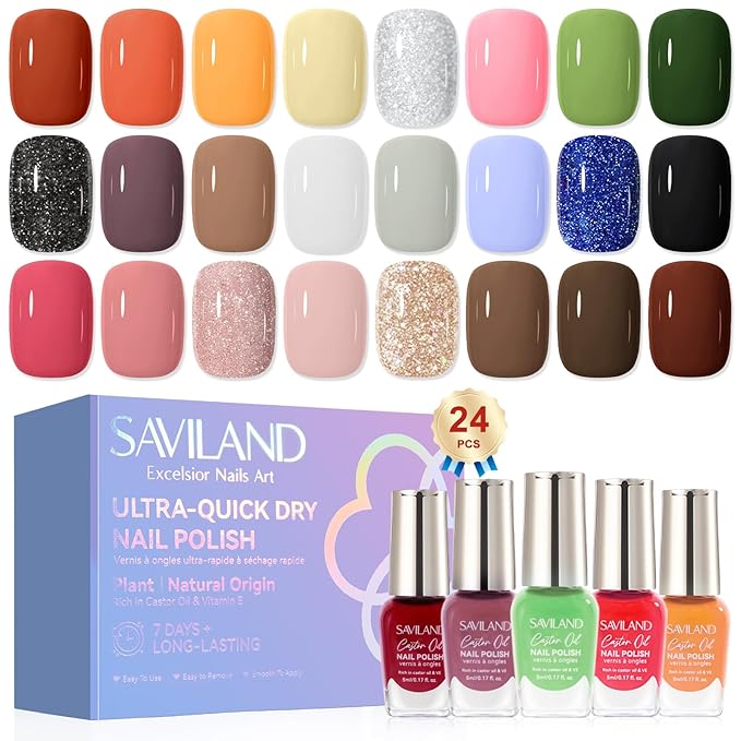 - Quick Air Dry Fall Nail Polish Set: SAVILAND Nail Polish Set contains 24 vivid colors via Colors Locked X Tech, and with nail polish dries quickly in 30-60s, no need to wait for long time to apply multiple coats for a salon-quality effect. 24 colorful options perfect for every mood, season, and occasion. Whether you're enjoying a girls' night out, a romantic candlelit date, or a cozy solo evening, there's always a nail polish color for you sparkle out loud
