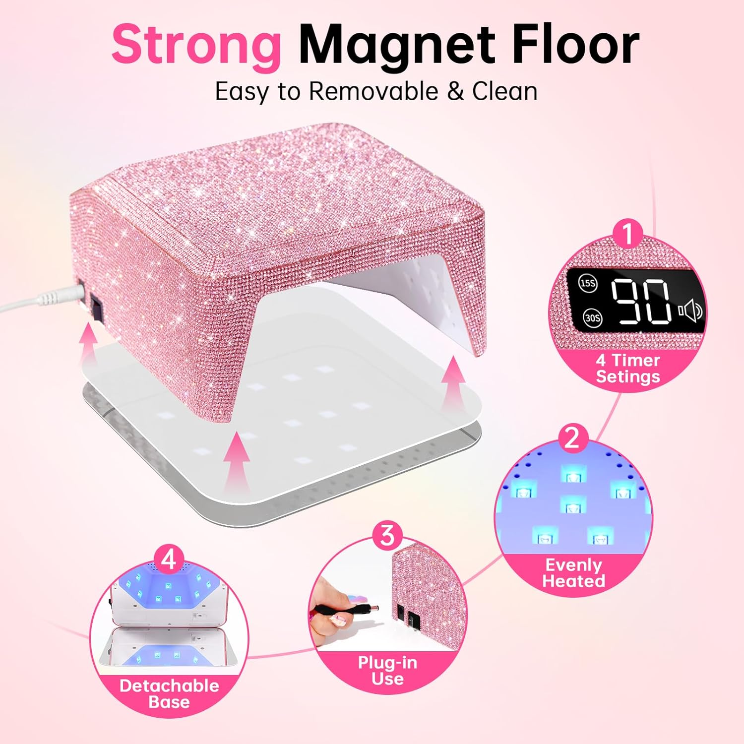 - 【Sparkling & Spacious Design】Every inch of the product is meticulously adorned with hand-applied diamonds, resulting in a stunningly shiny surface. The meticulous craftsmanship gives the product a unique and distinctive appeal.Its spacious design accommodates the simultaneous curing of up to five fingernails or toenails. With its user-friendly operation and professional design, it's perfect for any occasion, whether you're running a professional salon or engaging in a DIY nail session at home