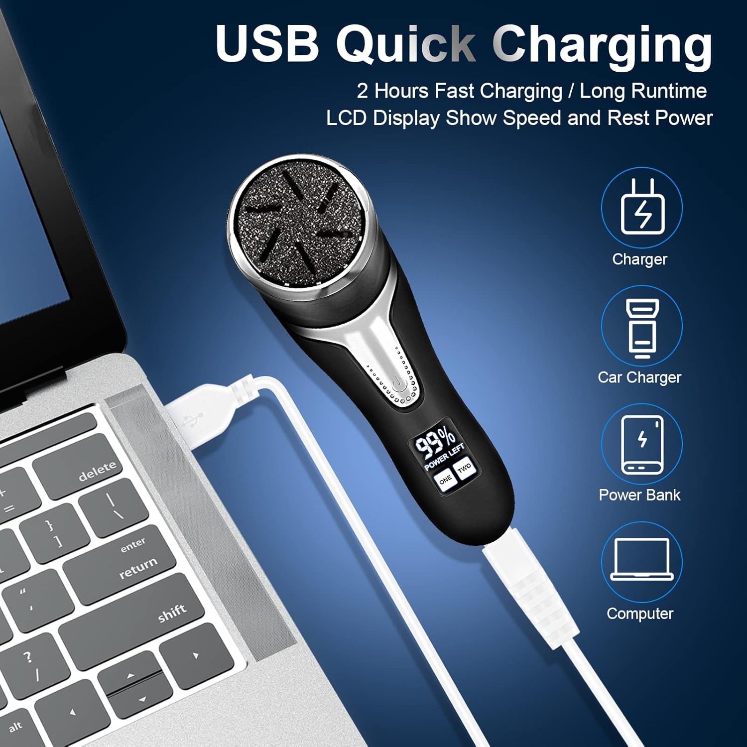 - Rechargeable, Long-Lasting, Easy to Use ----Included USB charging cable, This electric foot file can be charged via any USB port, and have a long runtime 2hours after full charged .and this dead skin remover for feet have LCD Power display let you clear know the rest power it left. remind you charge in time