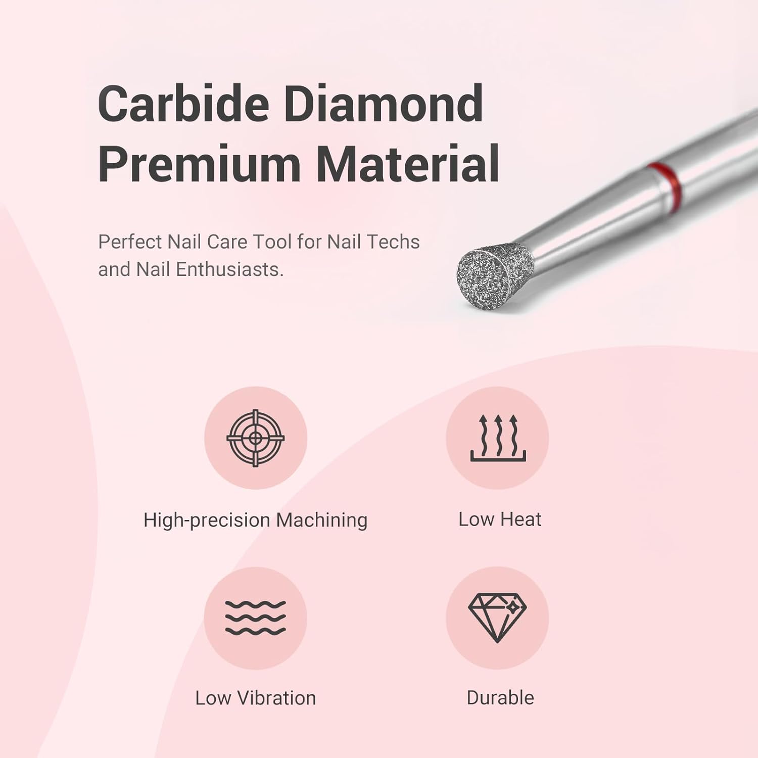 - Professional Carbide Diamond Nail Drill Bit: Made of premium strength carbide diamond material, this high precision machining nail bit comes with excellent heat dissipation, low vibration, low noise, and hard-wearing features. Perfect nail care tool for nail techs and nail enthusiasts.