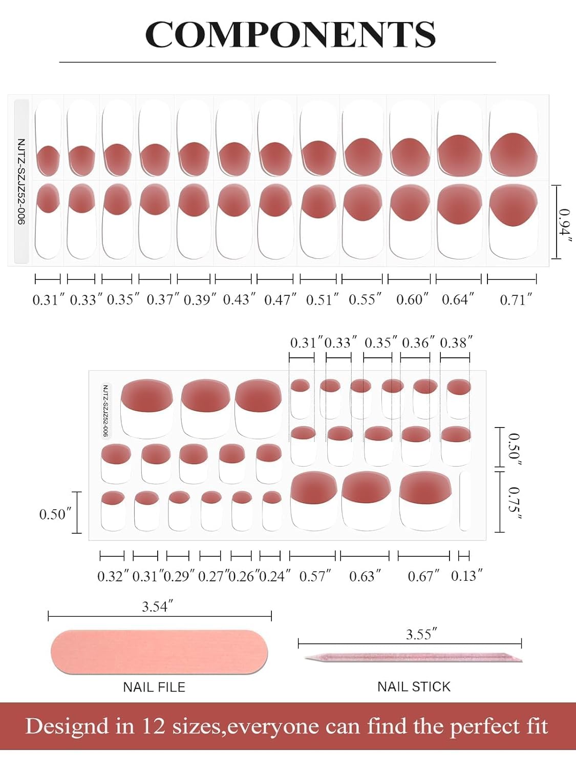 - Gel Nail Strips Set: The package contains 52pcs easy-to-use gel nail polish wraps(28pcs gel toenail strips&24pcs gel nail strips) in different sizes with 1 nail file, 1 nail stick. They are flexible that can be matched with any type of nail sizes and adjusted according to the shape, so they are wearable for different nail shapes.(There are 14/12 sizes available.)