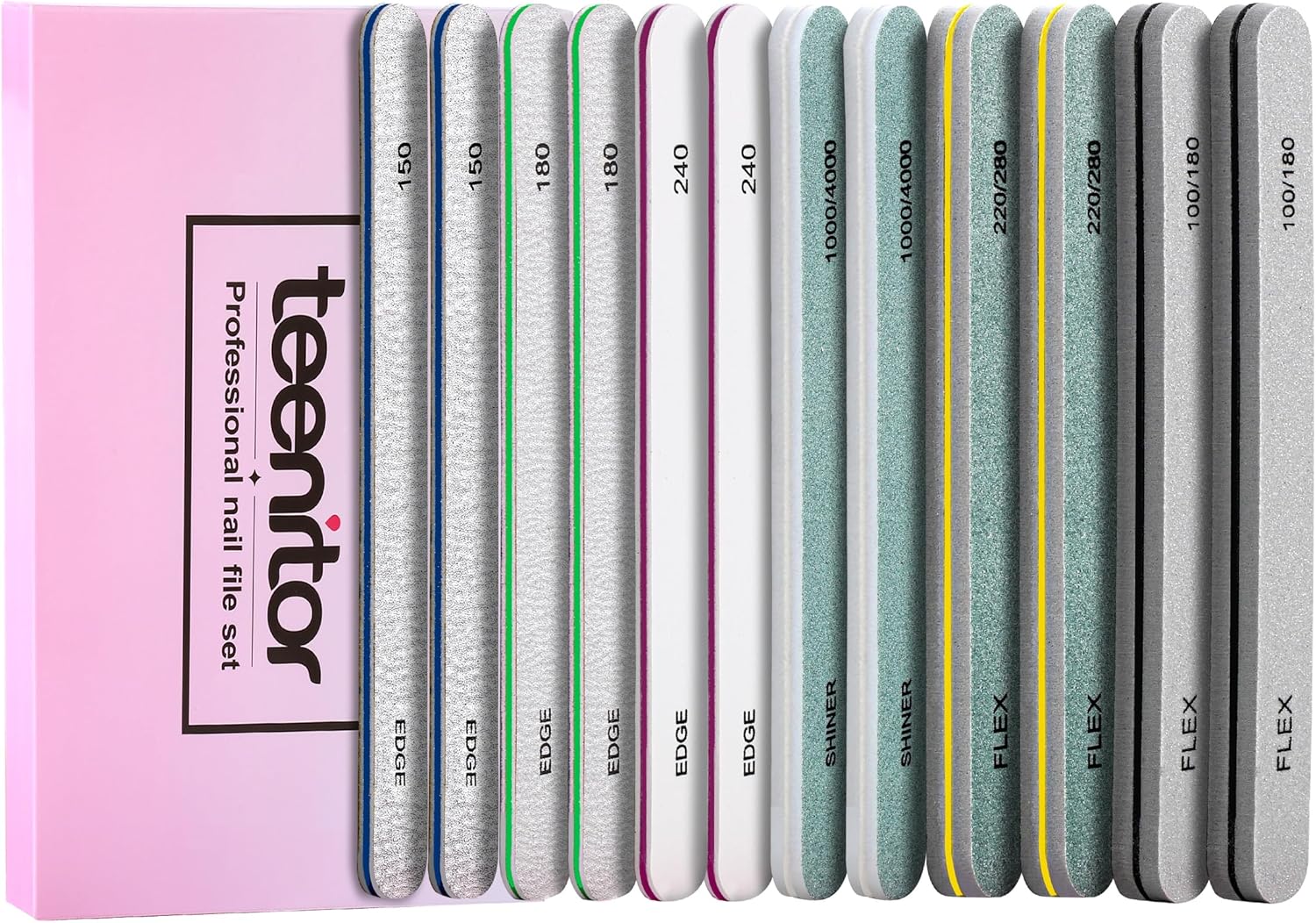 - Compare with all-in-one nail buffer block and 4 side buffing block, Teenitor buffer nail file provide more detailed division of grade files and grit, which reach 9 different types, file 150, 180 and 240, sponge 100 and 180, sponge 220 and 280, buffer 1000 and shiner 4000, professional and excellent salon nail file quality for a long time use