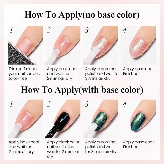 - Air Fast Drying: Experience the ultimate convenience with our Aurora Nail Polish, featuring a quick-drying formula that air dries in just 5 minutes, saving you precious time and allowing you to showcase your stunning nails in no time