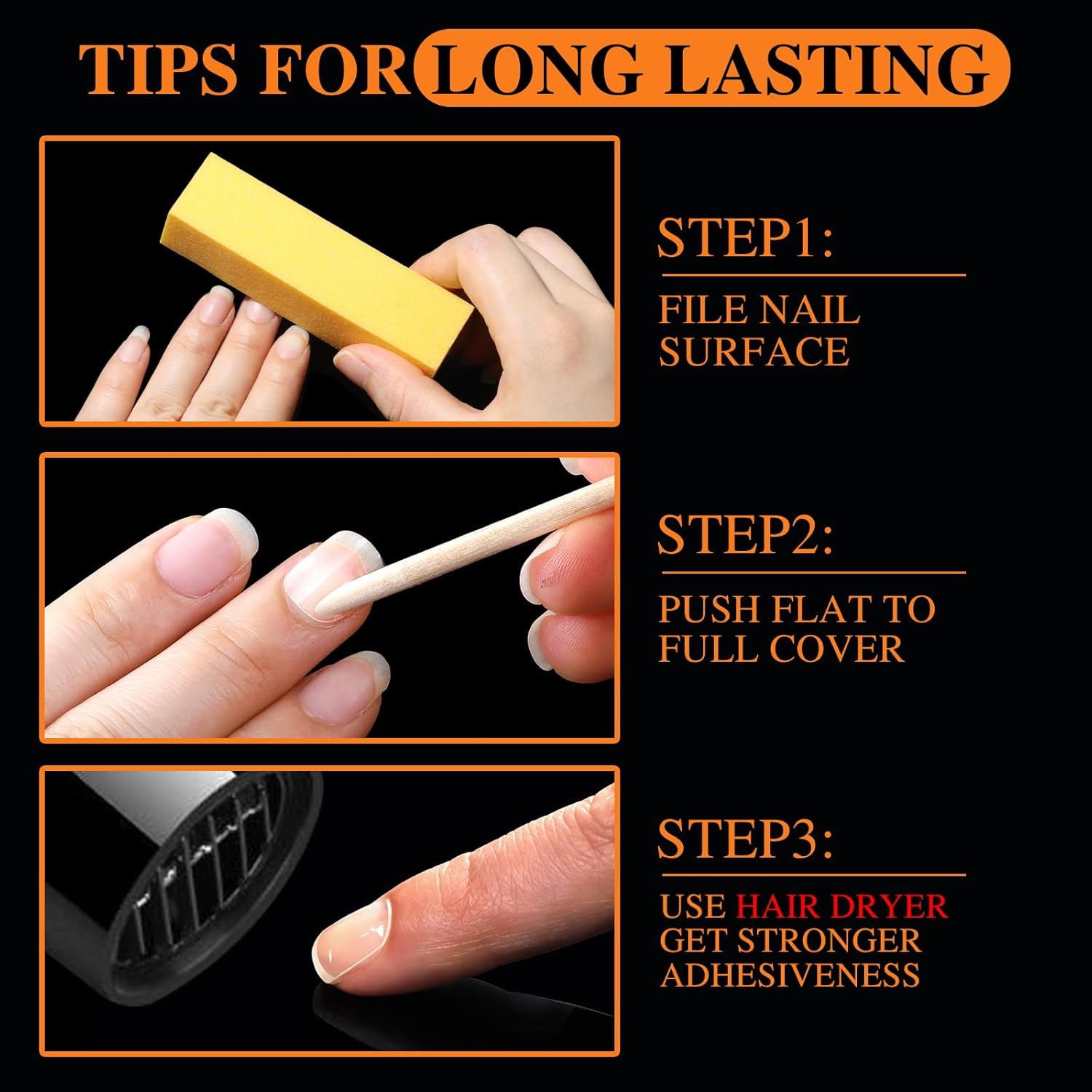- Tips for Long Lasting Especially in Cold Weather: Nail Adhesive Tabs also call jelly glue, stickiness is very affected by the weather. For better stickiness, you can use sponge file to file nail surface to make it rough; stick it on nail, use hair dryer to heat it for 15s; use wooden stick push flat to full cover your nail surface; remove thin film then use hair dryer to heat it 15s again; stick false nails and press 30s. Make sure long-lasting, please wash your hands after 1-2 hours later