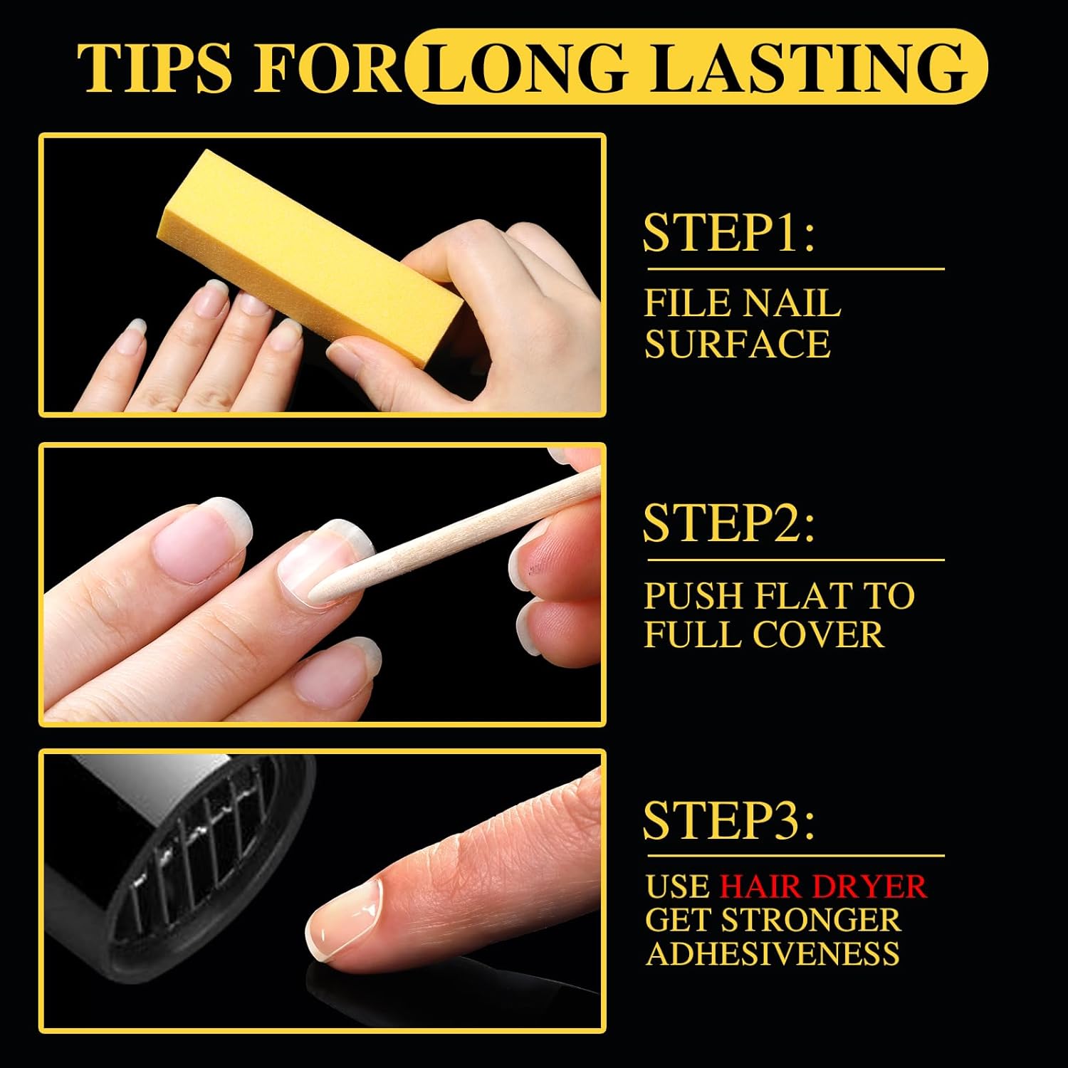 - Tips for Long Lasting Especially in Cold Weather: Nail Adhesive Tabs also call jelly glue, stickiness is very affected by the weather. For better stickiness, you can use sponge file to file nail surface to make it rough; stick it on nail, use hair dryer to heat it for 15s; use wooden stick push flat to full cover your nail surface; remove thin film then use hair dryer to heat it 15s again; stick false nails and press 30s. Make sure long-lasting, please wash your hands after 1-2 hours later