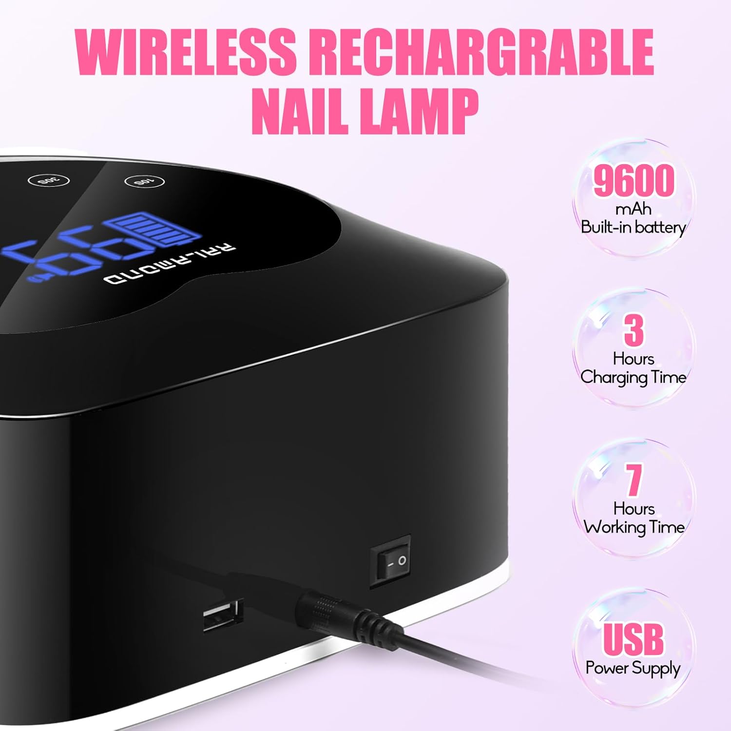 - 【Rechargeable & Cordless UV Nail Lamp】With its built-in rechargeable battery, RALAMOND UV light for gel nails can run for 6-7 hrs with a full charge. Say goodbye to the limited cord nail lamps for gel polish and embrace the flexibility on the go! Led nail lamp adopts hybrid UV & LED dual-light source that (365+405 nm wavelength) provides speedy curing for gel polish while ensuring no blackened hands and protecting your eyes.