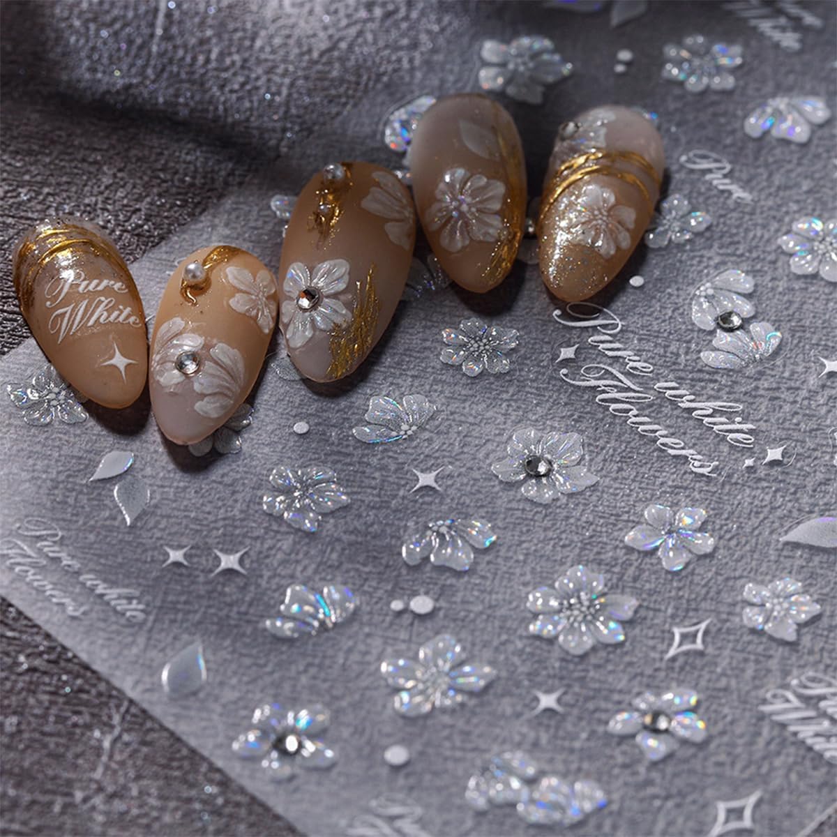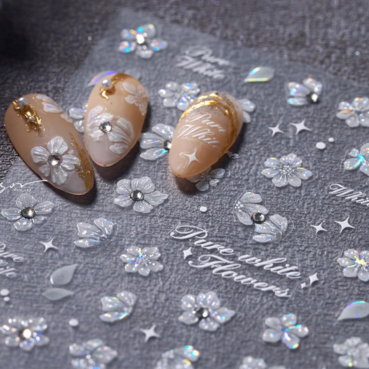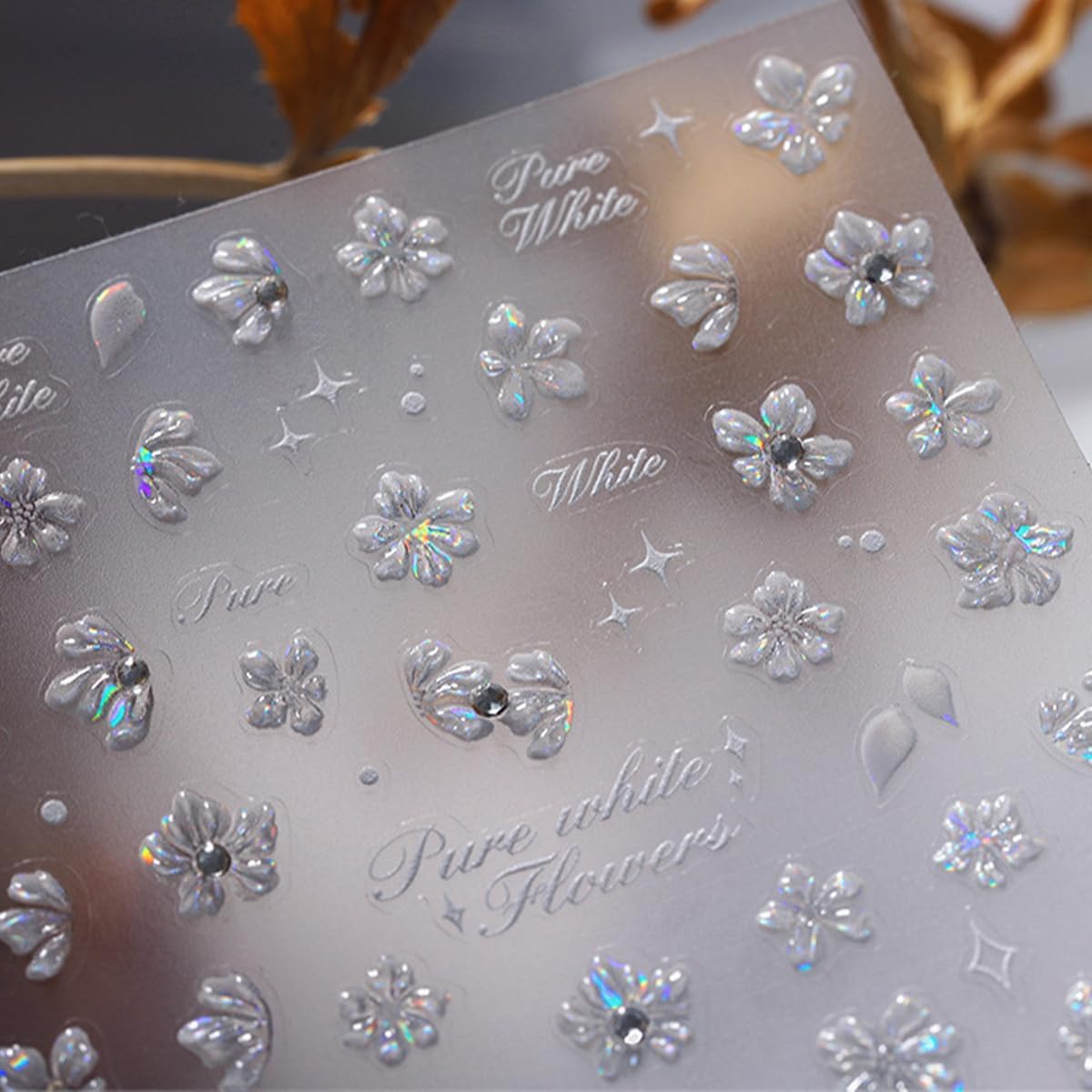 - 5D Flower Nail Stickers Set: You will get 1 sheet of white flower nail stickers with rhinestone, that will not fade, are more realistic than ordinary stickers, and you can well create a more detailed and delicate nail art effect.