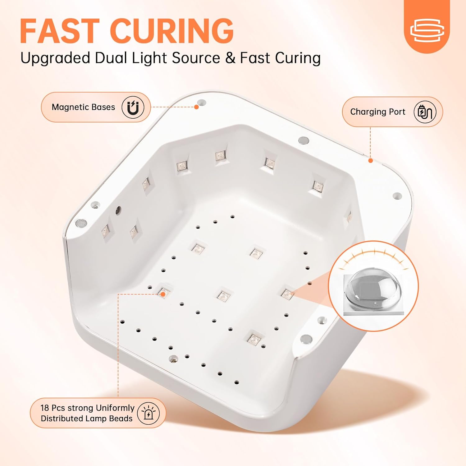 - Fast Curing All Nail Polishes: Different brands of nail polish cure at different speeds. This gel lamp equipped with 18 dual light source lamp beads, the uv light for nails fast cure all gel nail polishes, base coat, top coat, color gel, hard gels, builder, acrylic, sculpture gel, gem glue etc. (not for regular nail polish). You can do a beautiful manicure at home or at the salon