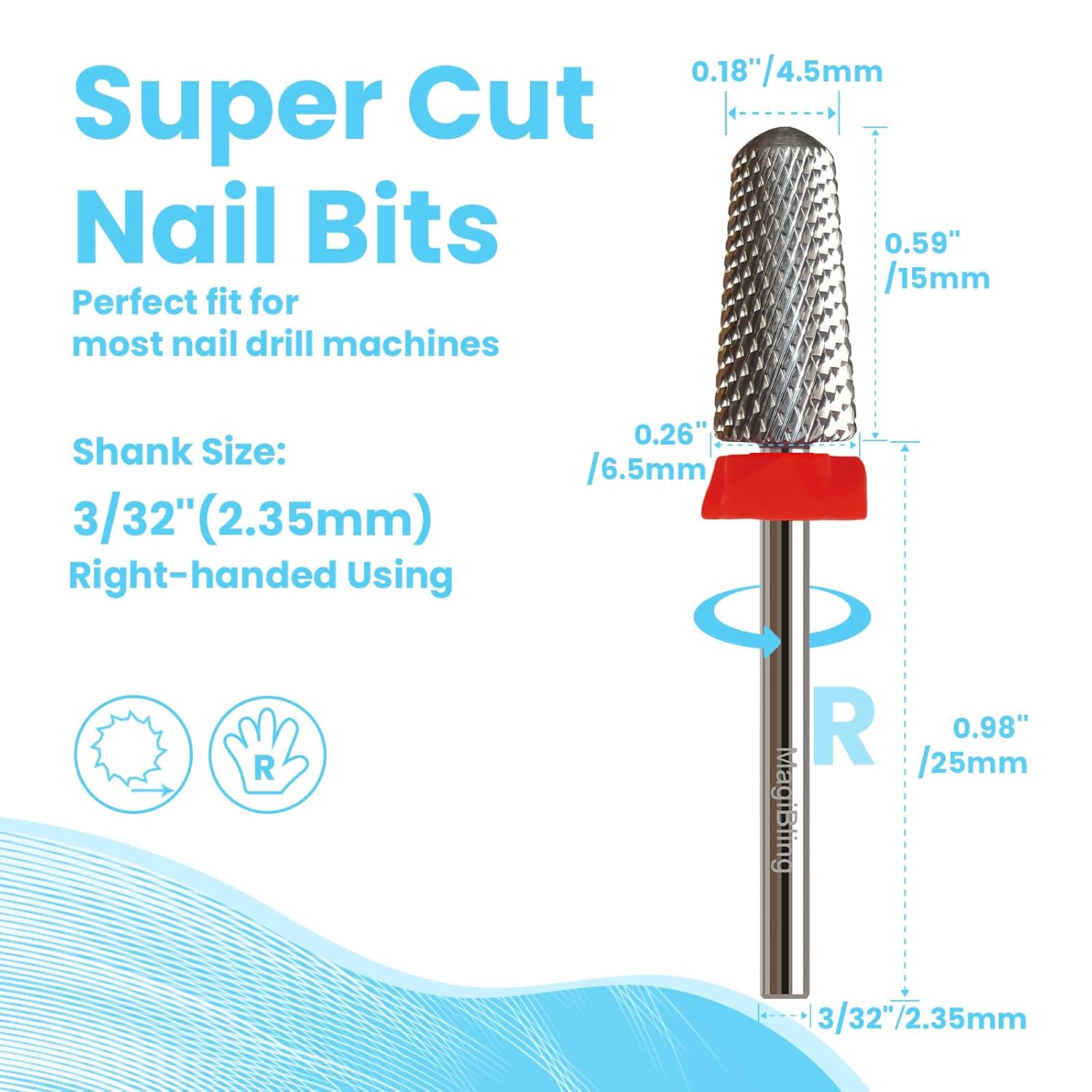 Super Cut Tapered Barrel 3/32'' Safety Tungsten Nail Drill Bits, Remove Gel Fast, Right handed, Suitable for Manicure Pedicure Cuticle Gel Polishing, Technicians Bits, Grit: Fine.