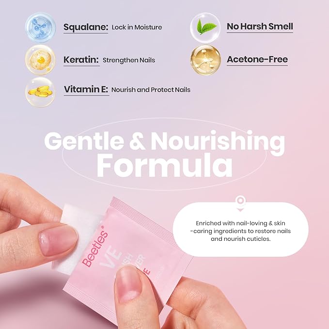 - Remove & Nourish 2-in-1: Infused with squalane, keratin, and vitamin E—these wipes repair as they work! The “remove + care” tech strengthens nails, smooths ridges, and conditions skin. Perfect for weak nails: nails—transform removal into a mini-treatment for healthier hands.