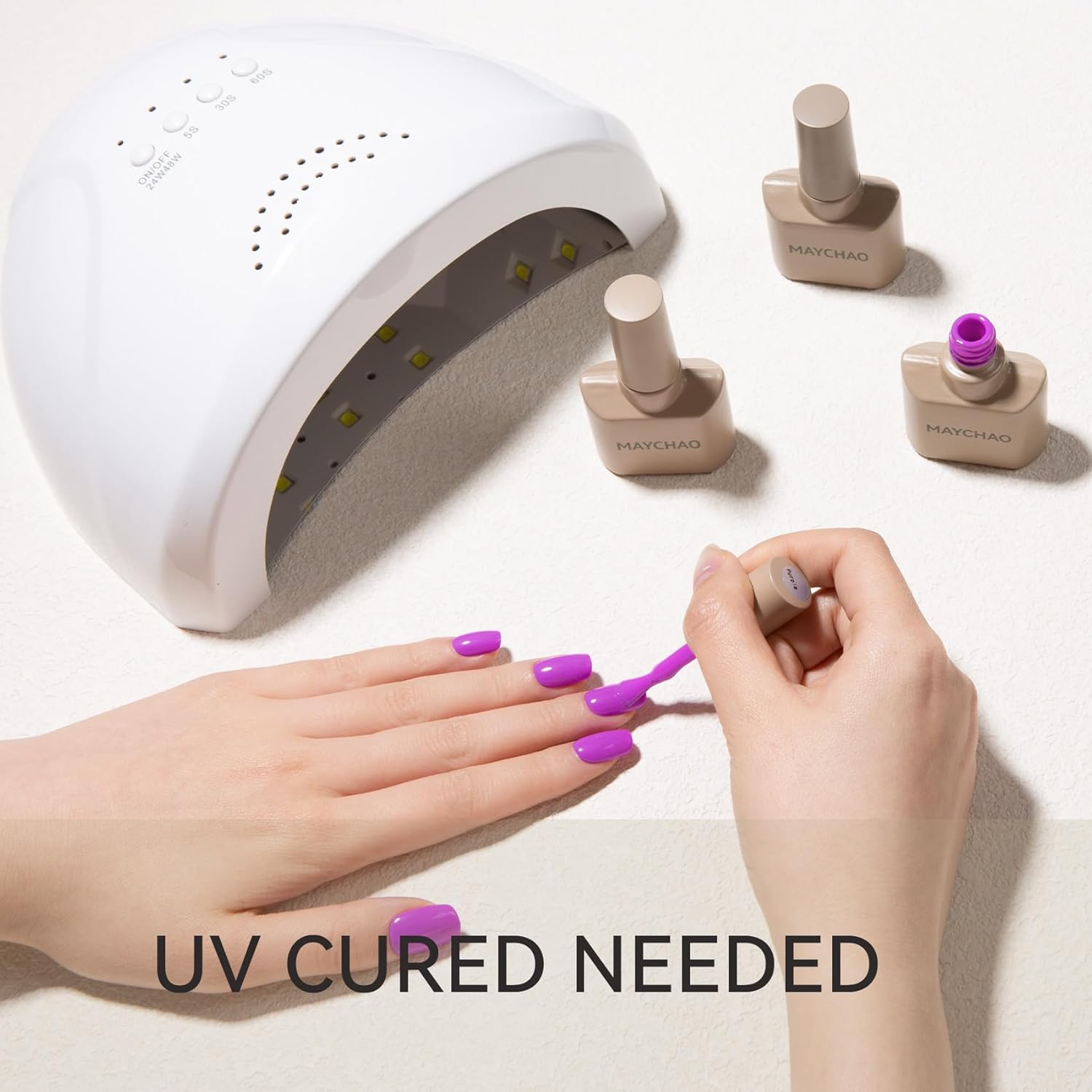 - Fast and Simple Nail Polish: MAYCHAO Gel polish must be cured under an LED light. It is necessary to apply a base and top coat. Average LED light duration is 60-120 seconds. Simple application and tenacity.