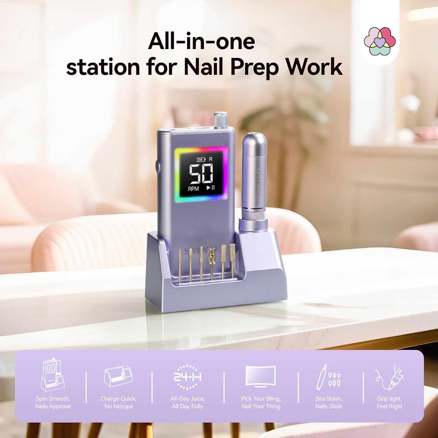 - Charge & Stow with Ease: Simply insert the nail drill into its smart charging base for automatic charging – no more tangled cords! This base also doubles as a secure storage solution for both the drill and bits, keeping your nail art essentials neatly organized and always within reach